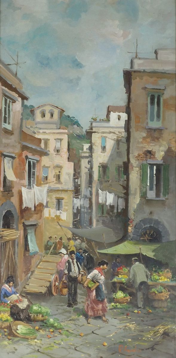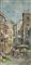 Lotto 353 | Pittore del '900 "Mercato di fiori tra le case" cm. 80x40 - olio su faesite