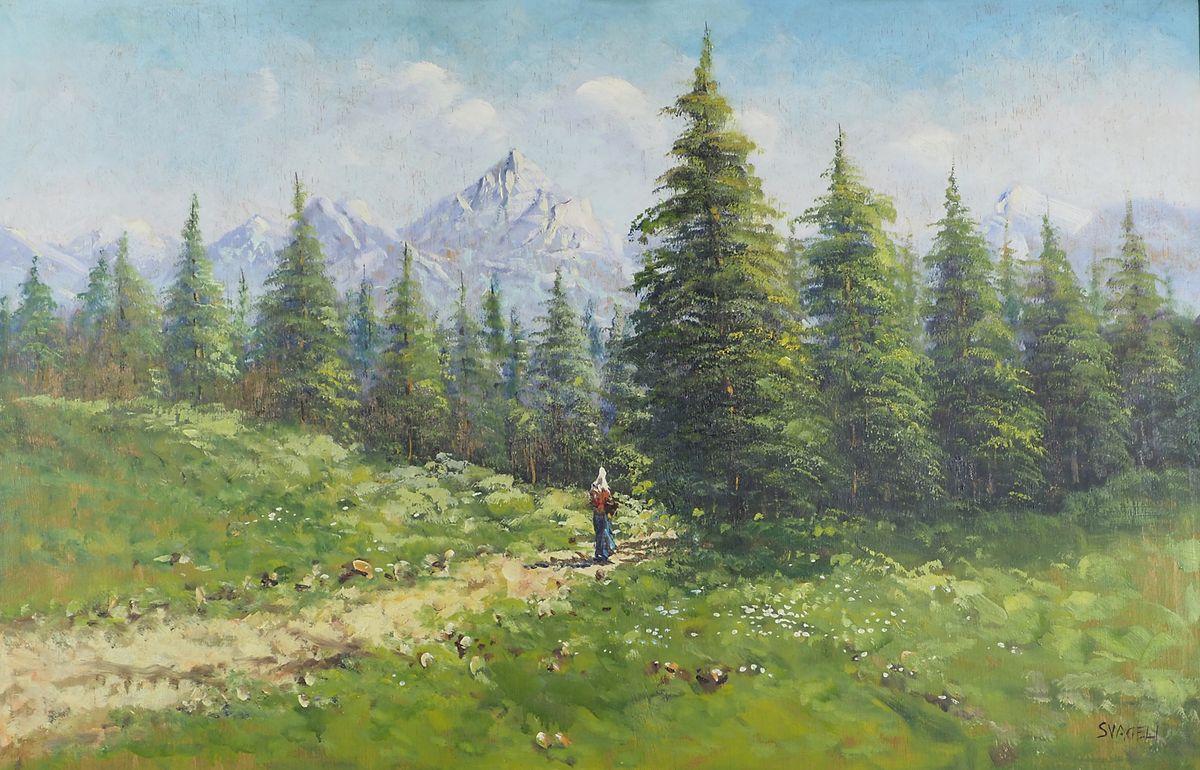 Svageli Attivo a Trieste ai primi del ‘900 "Camminata sotto le montagne" cm. 69x105 - olio su tavola Firmato b. a d.