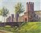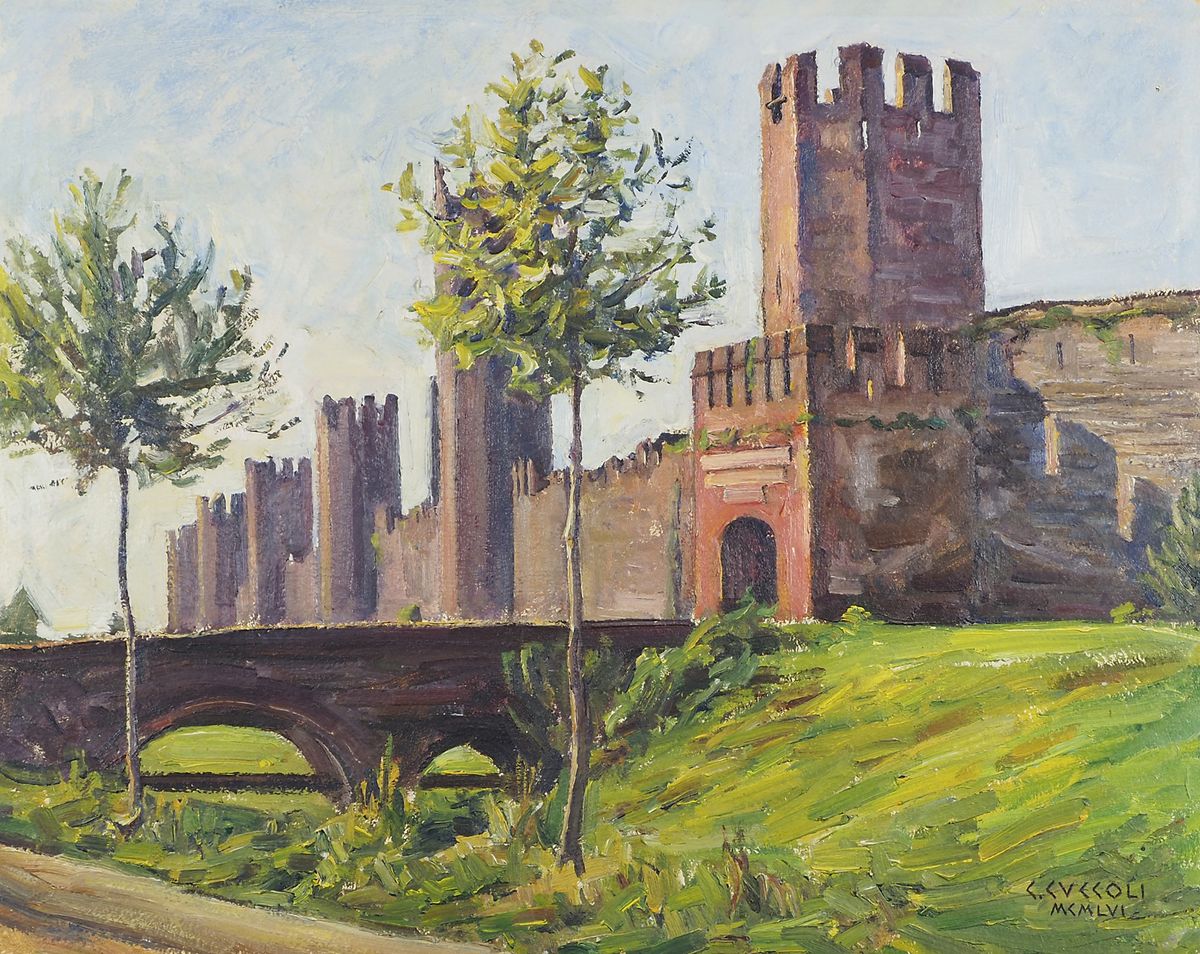 Cesare Cuccoli 1895-1978 "Montagnana, Porta Venezia" cm. 40x50 - olio su cartone Firmato b. a d. e datato 1956. Titolo al retro.