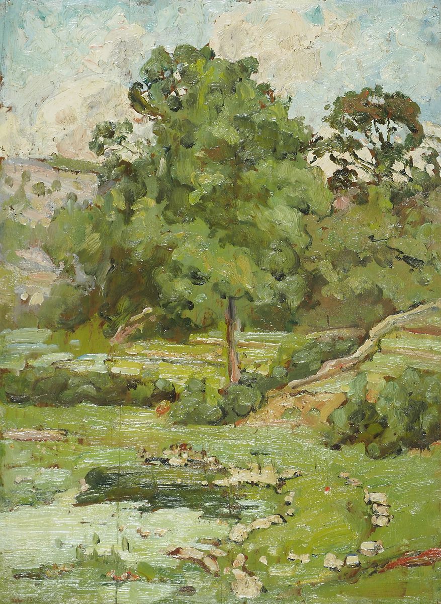 Carlo Wostry Trieste 1865-19437 "Paesaggio montano" cm. 35x27 - olio su tavoletta Etichetta dell'Artista al retro.