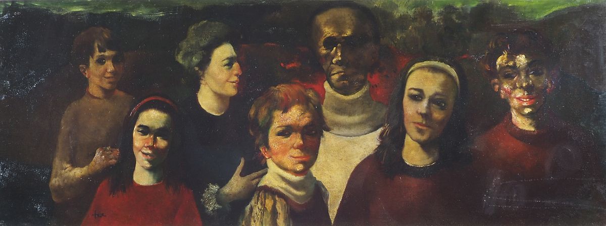Anzil (Luigi Toffolo) Hausham 1911. "La Famiglia Fontana" cm. 50x130 - olio su tavola Firmato b. a s. Titolo, data 1970 e dedica al retro.