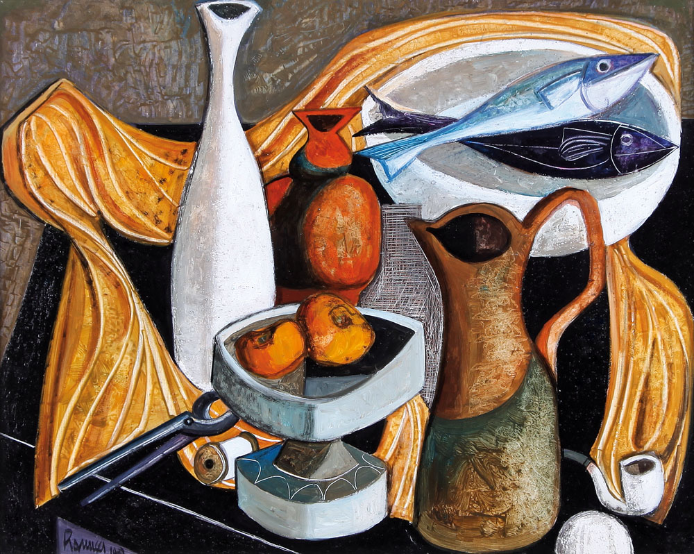 LUCIO RANUCCI Perledo (Co) 1924  Bric a brac della tavola nera, 1987 olio su tela cm. 40x50, firma e anno in basso a sinistra, titolo, firma, anno, archivio e timbro della Galleria Angolare al retro, timbro della Galleria Angolare , dichiarazione d'autenticità e archivio dell'artista su foto, certificato di autenticità della Galleria Family Club (Santhià-VC) allegato.