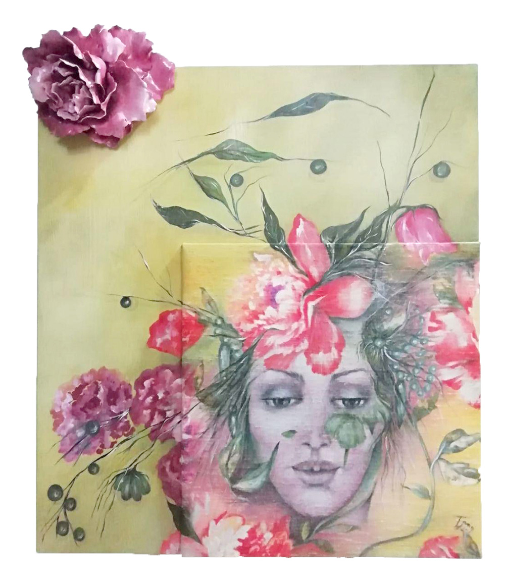ELIA TAMIGI dal ciclo: I miei racconti impaginati nella fantasia delle stoffe... LA GRANDE BELLEZZA. “IL SUSSURRO DEI FIORI, 2018 dipinto su seta e tavola in legno con inserto floreale ceramico cm 50x40x30
