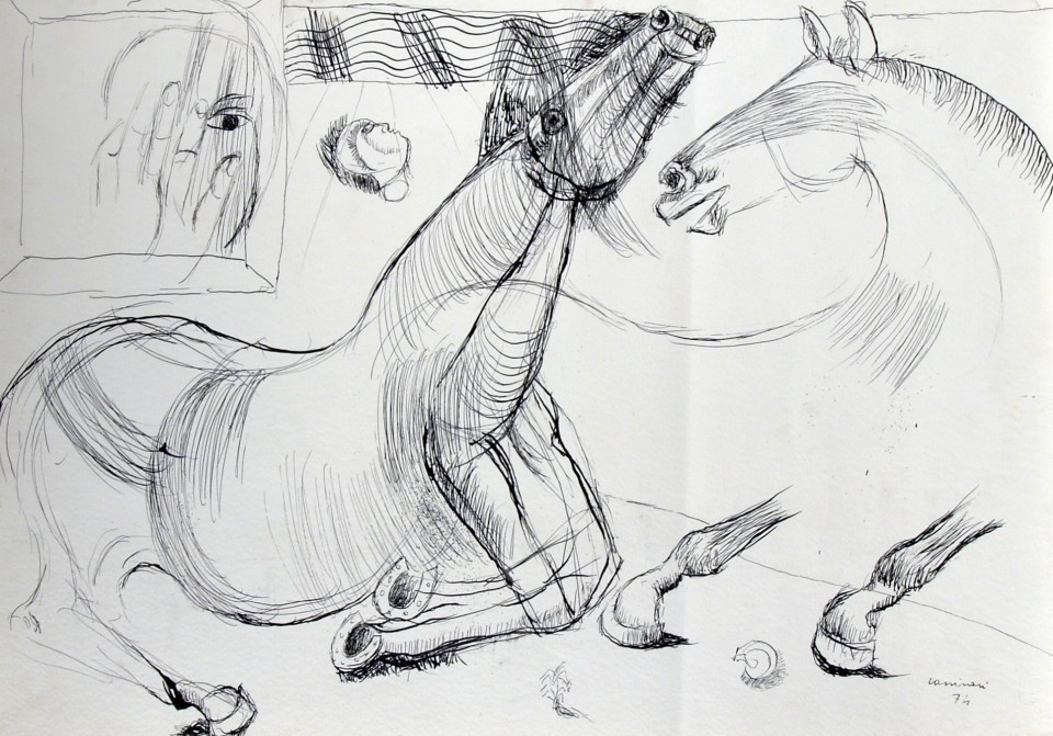 "Studio di cavallo" 1974 China su carta cm. H: 50.00 P: 70.00 Firma in basso a destra. Opera originale utilizzata per la realizzazione di incisioni su oro attraverso tiratura a 500 esemplari. Edizioni "Quadri d'oro". Variabile di perizia rilasciata dalla Galleria Pace (MI).
