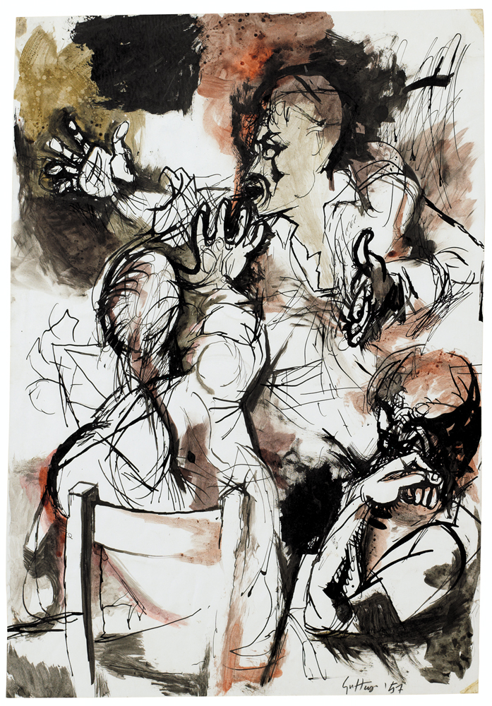 RENATO GUTTUSO Bagheria (Pa) 02/01/1912 - Roma 17/01/1987 La discussione, 1957 tecnica mista (china e acquerello) su carta cm. 50x35, firma e anno in basso a destra, timbro e firma per garanzia e provenienza della Galleria Nuova Gissi (TO) su foto, opera registrata presso Gli Archivi Renato Guttuso come da dichiarazione su foto, pubblicata su Art Leader RM Edizioni numero 39 giugno/agosto 1998, pagina 74, pubblicata nel volume "I Classici della Pittura" Renato Guttuso, a cura di Mario de Micheli, Edizioni Il Torchietto (MI), pagina 95, tavola 15.