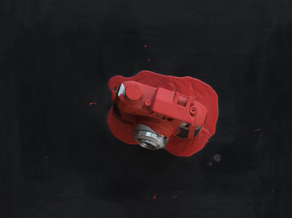 Macchina fotografica bruciata e acrilici su tavola dipinta