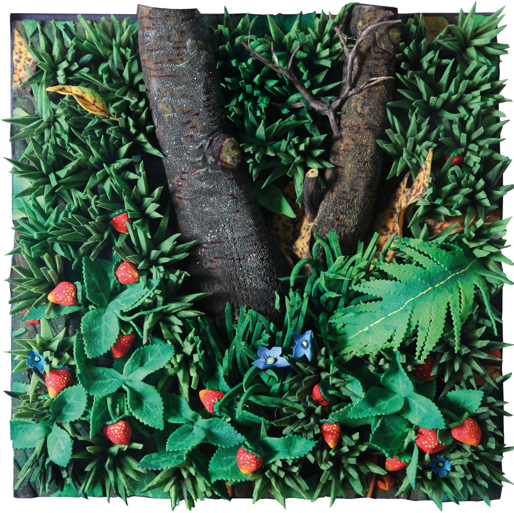 PIERO GILARDI Torino 03/08/1942 Fragole nel bosco poliuretano espanso cm. 50x50x20, firma e titolo al retro, entro teca in plexiglass.