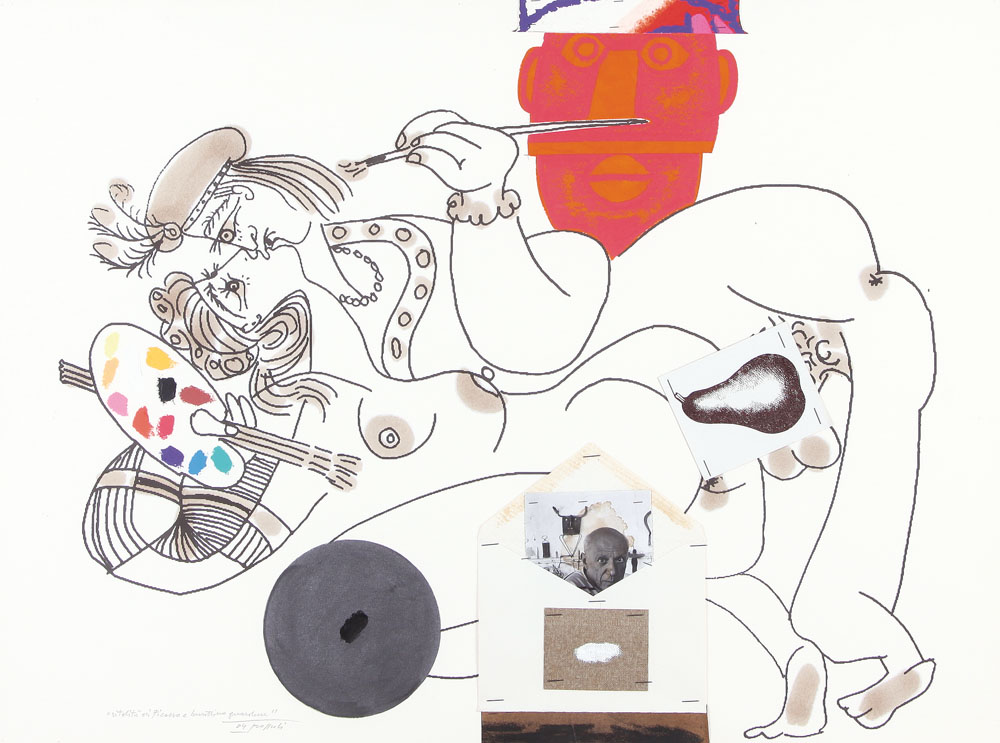 CONCETTO POZZATI Vo' Vecchio (Pd) 01/12/1935 Vitalità di Picasso e burattino guardone, 2004 tecnica mista e collage su cartoncino cm. 56x76, firma, titolo e anno in basso a sinistra, etichetta della Galleria De Foscherari (BO) al retro.