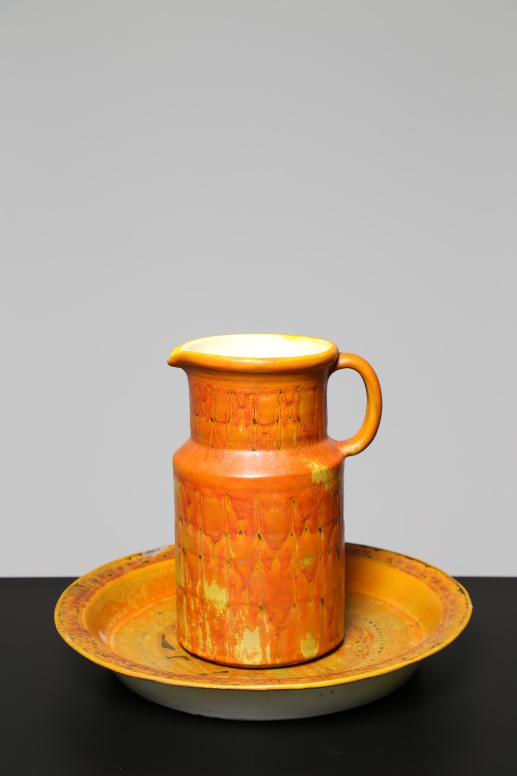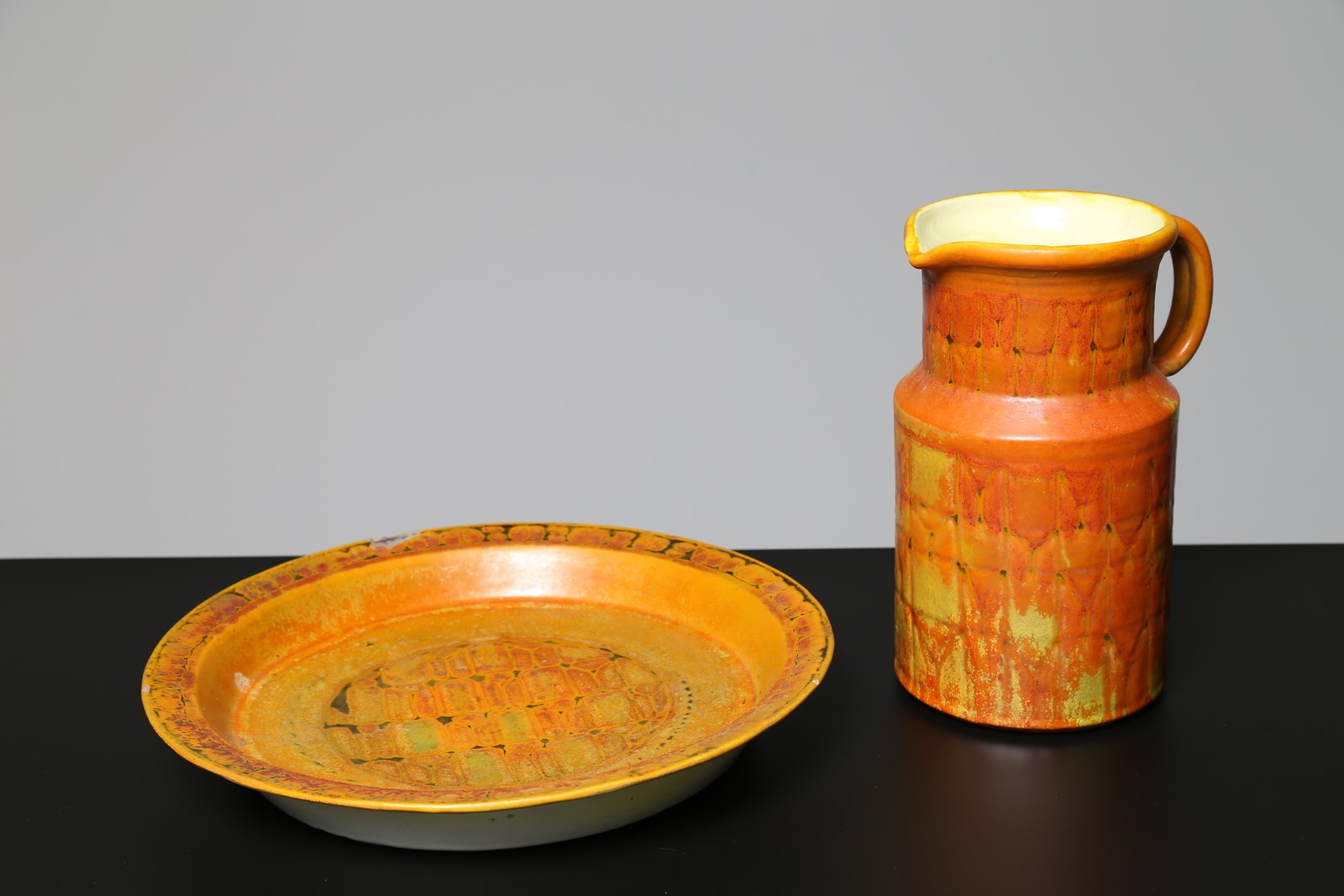 TASCA ALESSIO (n. 1929) Piatto e brocca. Ceramica grès. Cm 17,50 x 25,00 x 13,50. Firma e anno al retro, 1966.