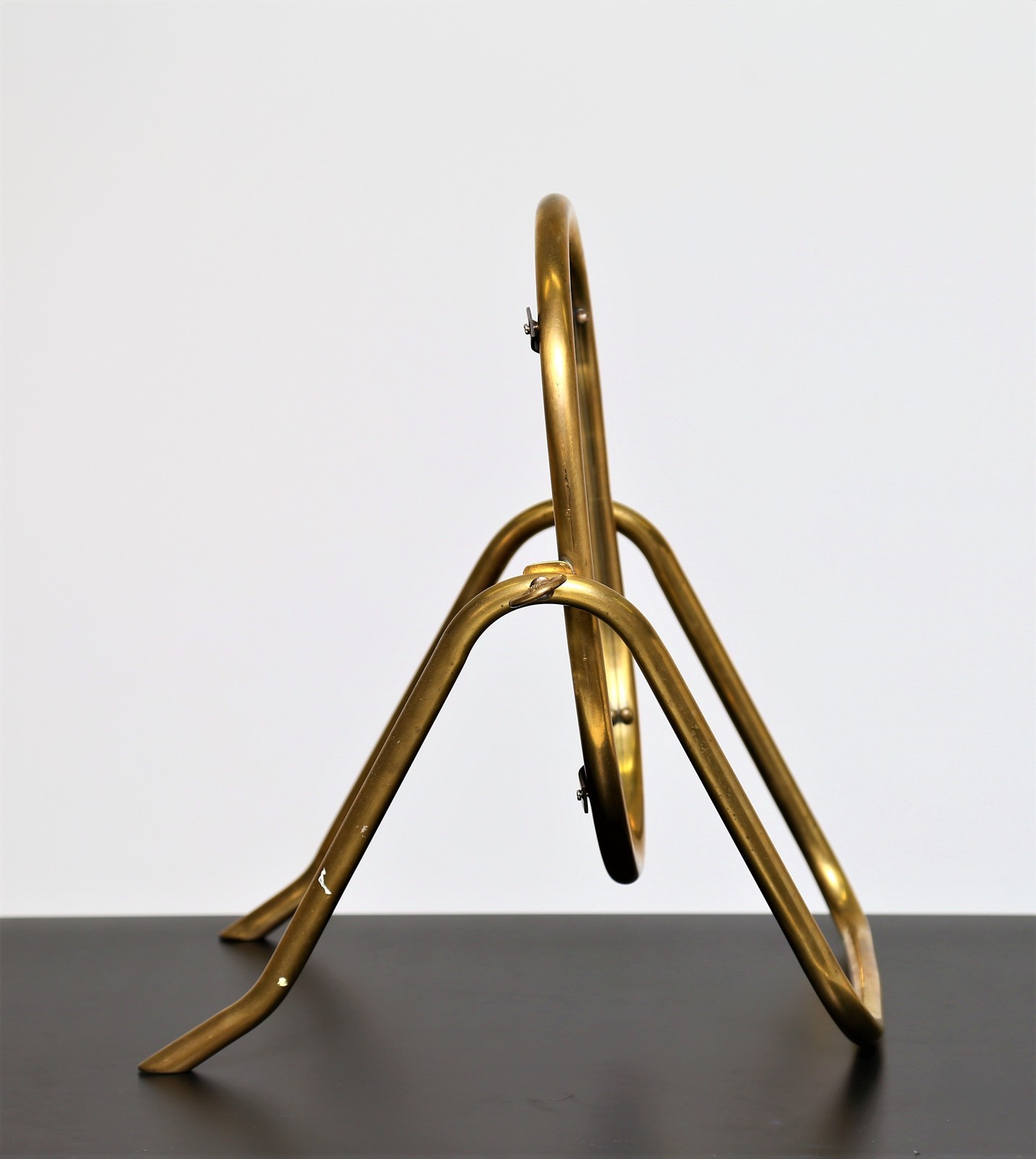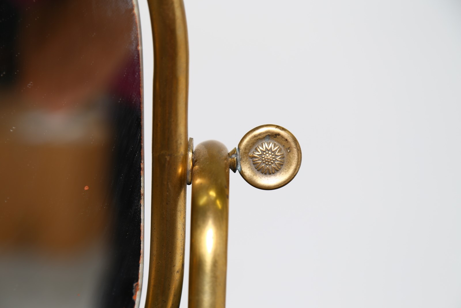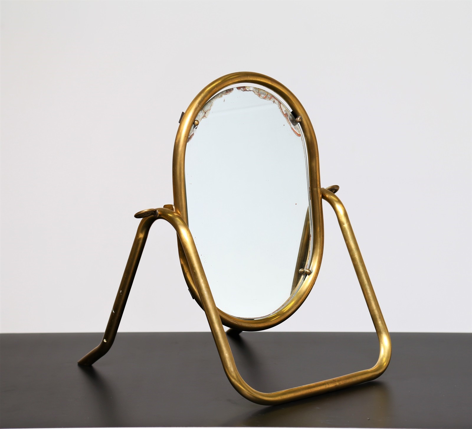 MANIFATTURA ITALIANA Specchio da tavolo. Ottone e vetro. Cm 36,00 x 40,00 x 35,00. Struttura in ottone regolabile, anni 50.