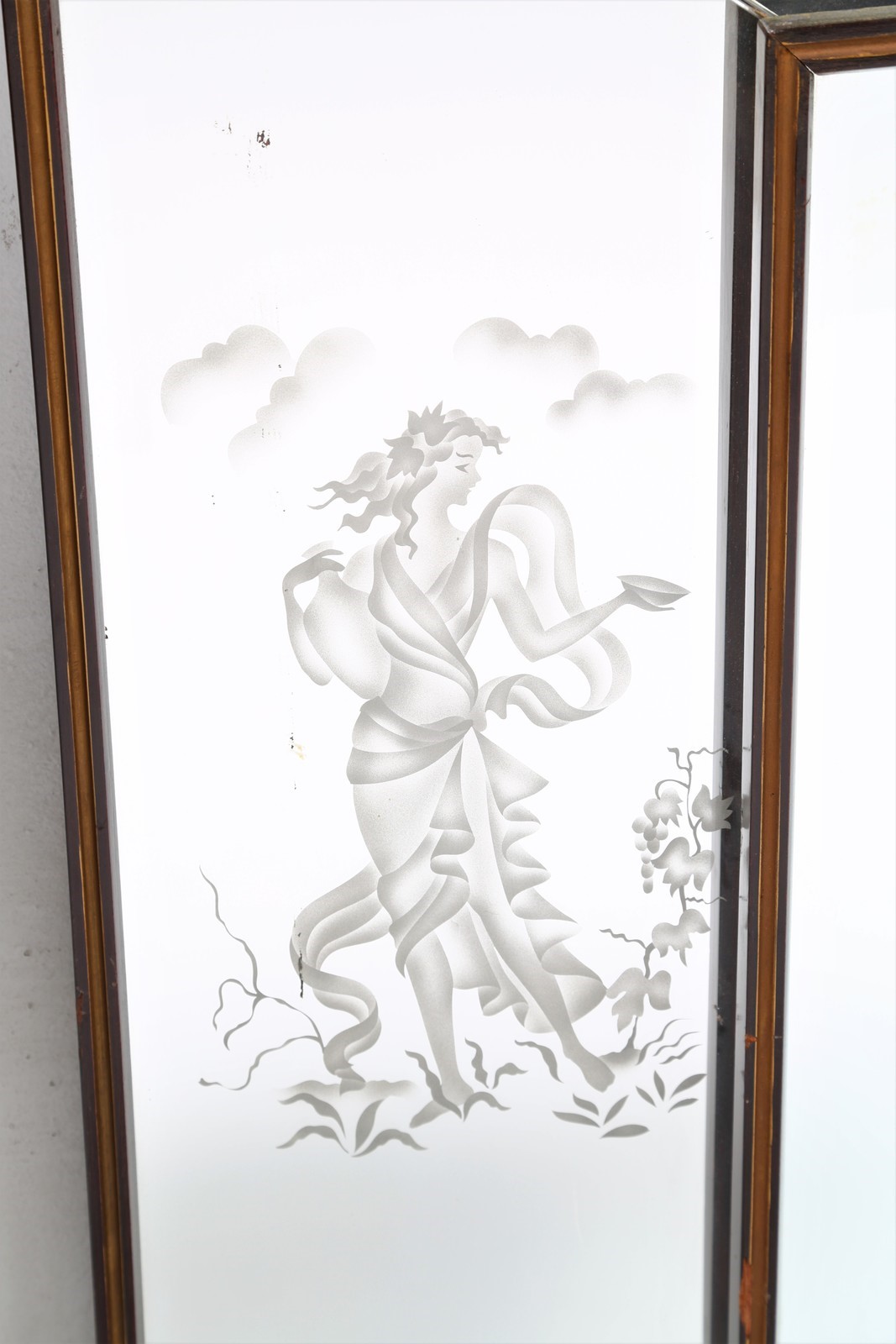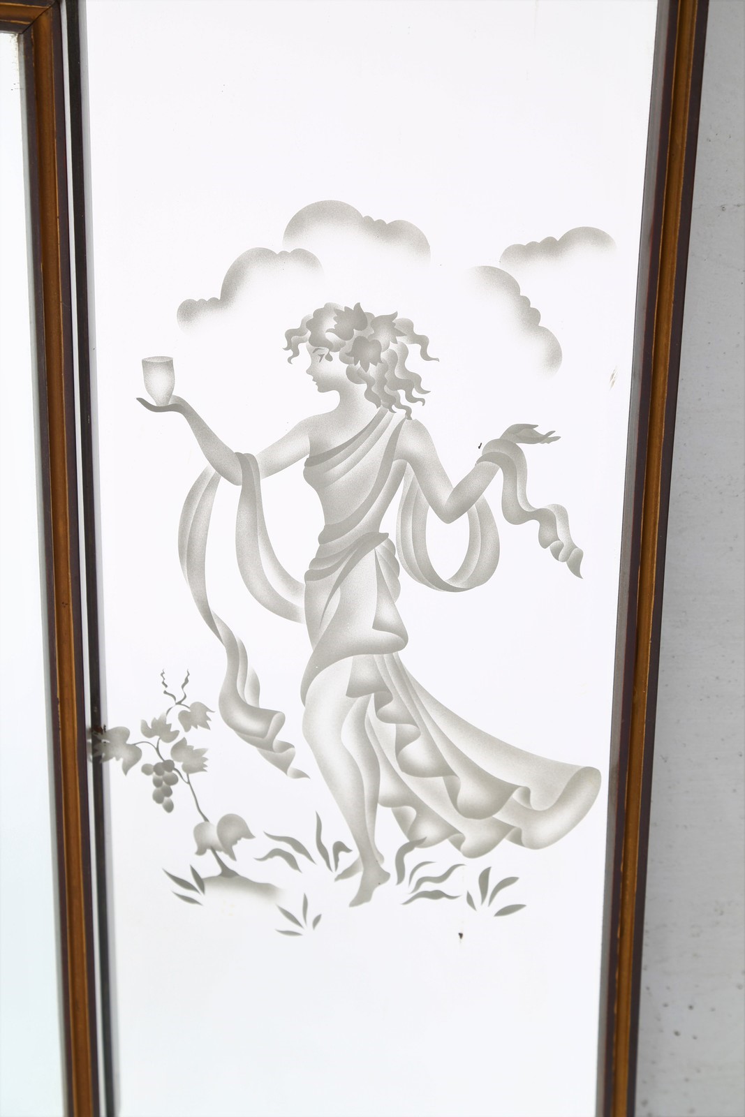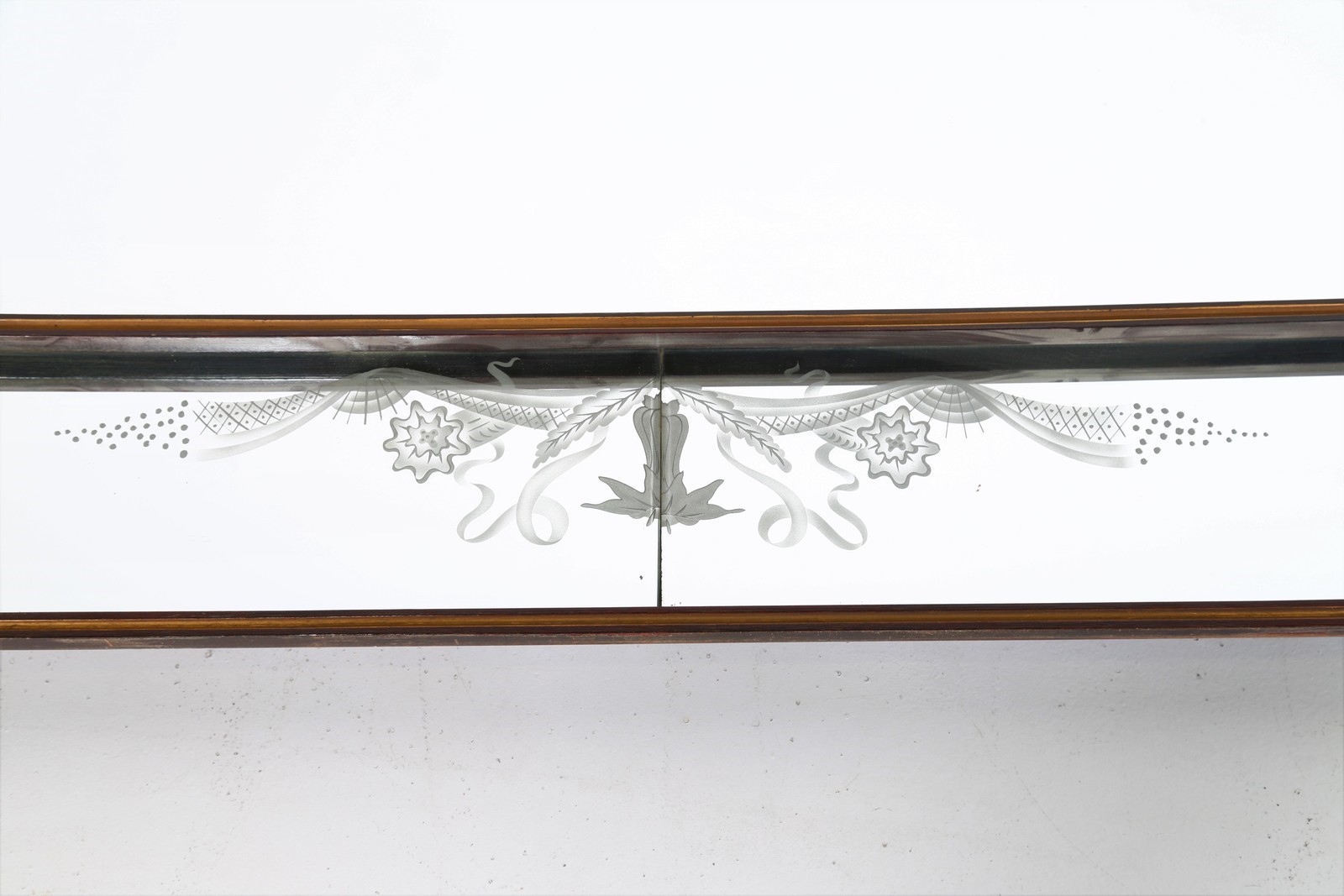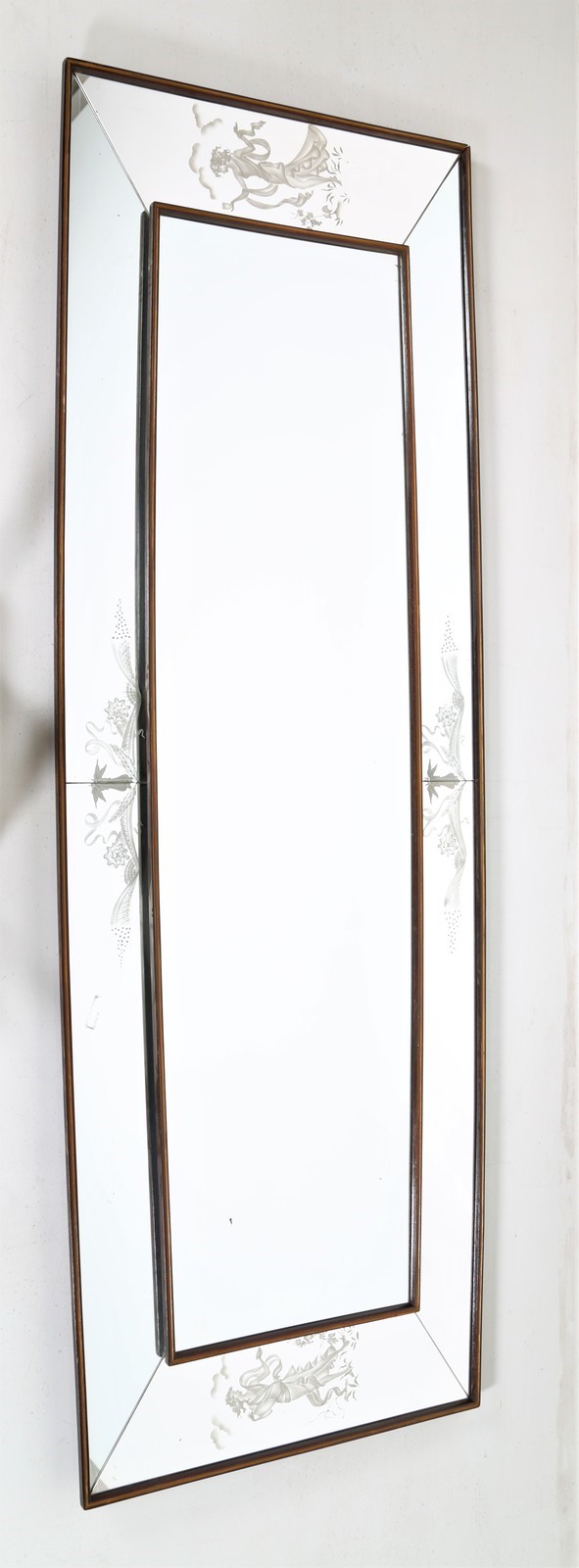 ITALIAN MANUFACTURE Mirror. Wood and glass. Cm 284,00 x 100,00 x 7,00. Wood with engraved glass, 50s