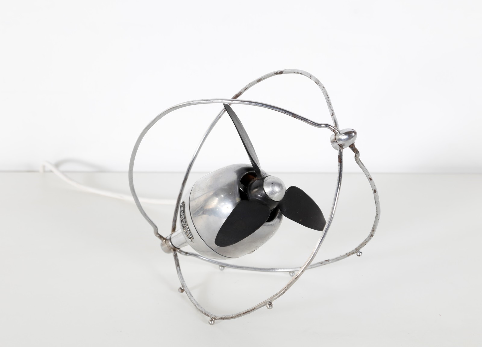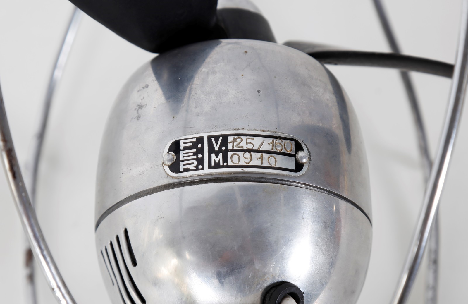 EZIO PIRALI (n. 1921) VE505 ventilator. Metal, plastic. Cm 22,00 x 27,00 x 22,00. For Zerowatt, manufacturer's trademark and edition 125/160, 1953. Compasso d'oro award in 1954.