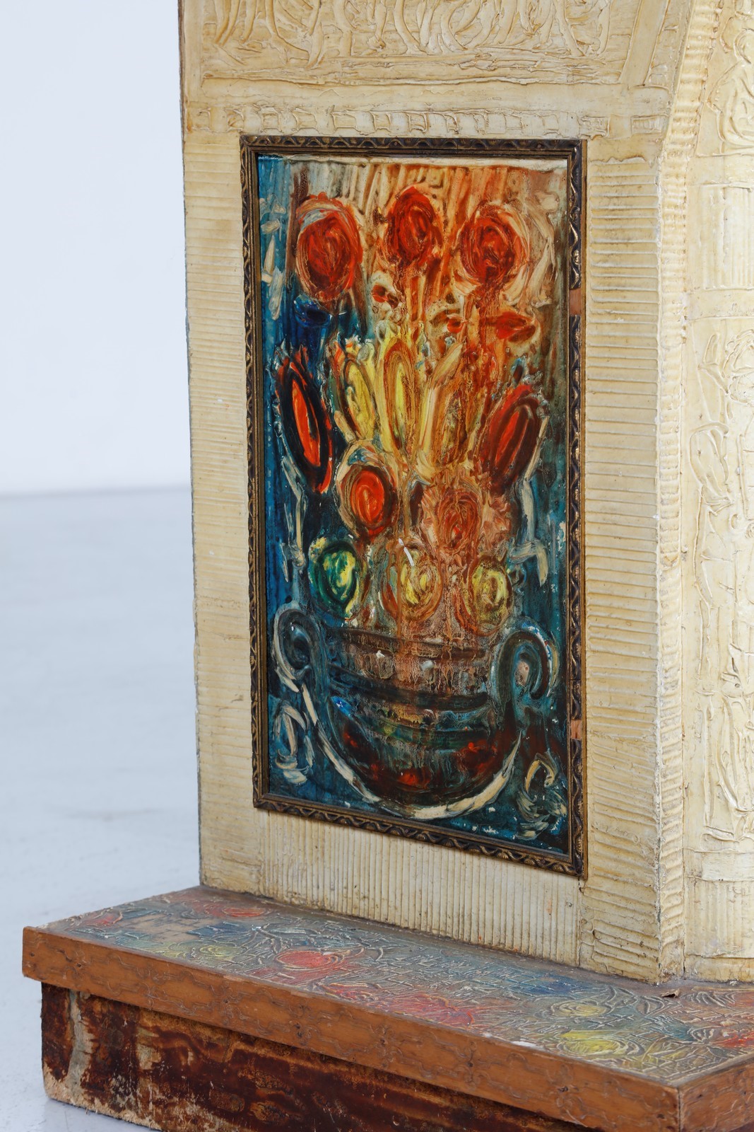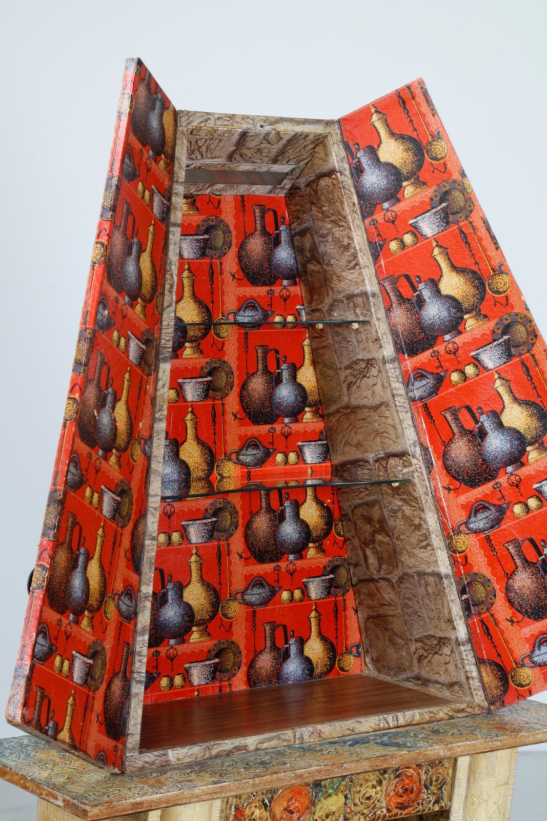 ITALIAN MANUFACTURE Faux fireplace with bar cabinet. Painted and lacquered wood. . Cm 104,00 x 186,00 x 49,50. Painted and lacquered wood with wallpaper applications, 50s.