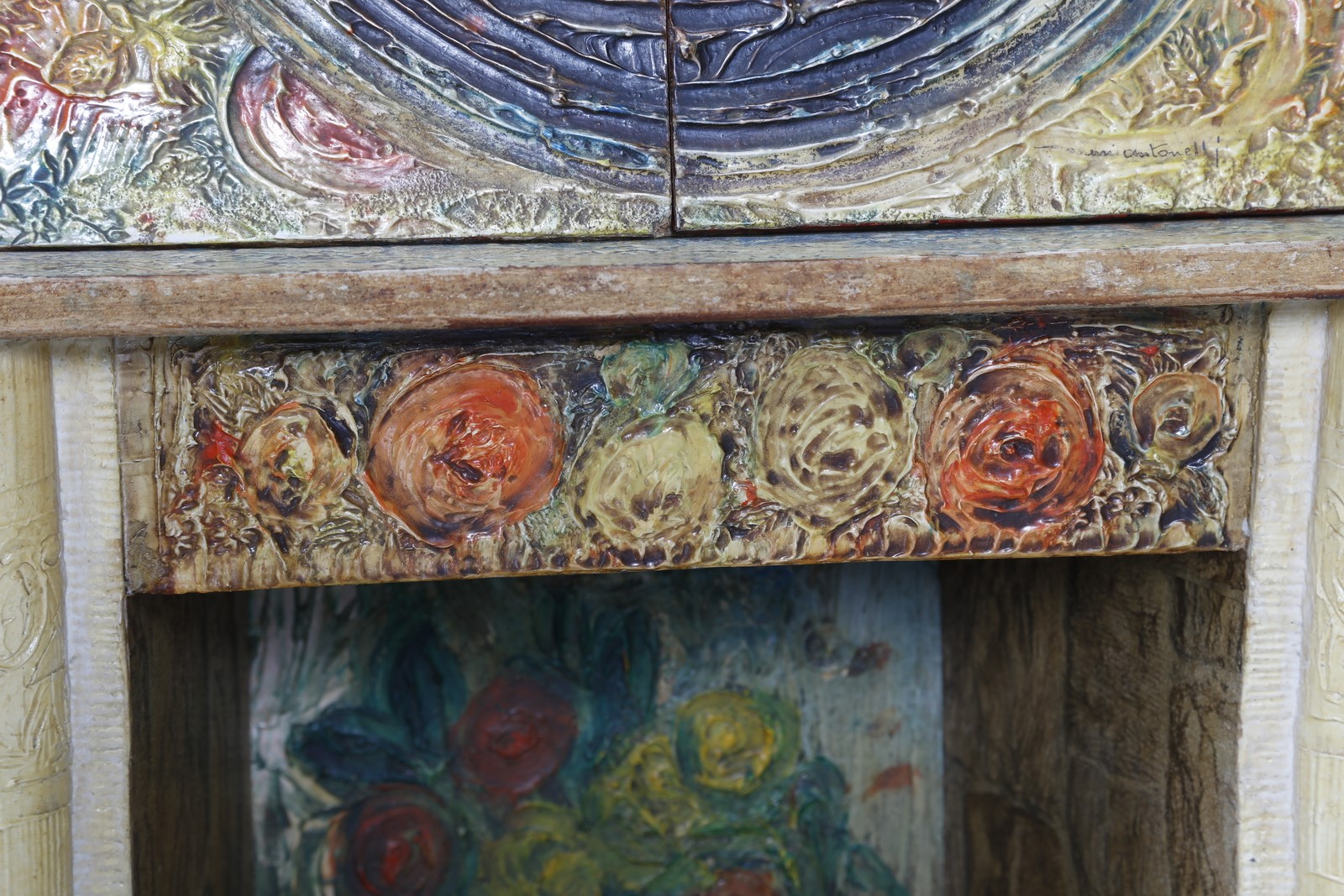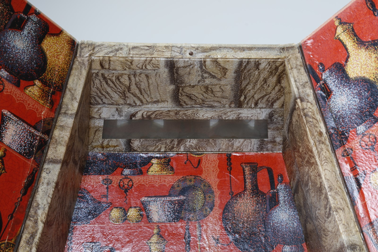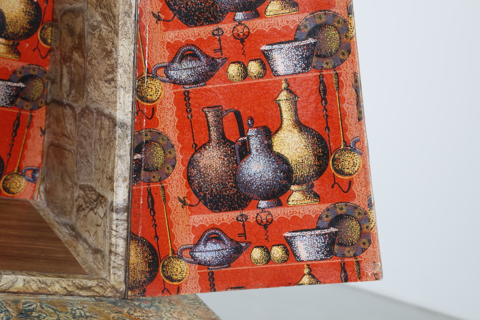 MANIFATTURA ITALIANA Finto camino mobile bar. Legno verniciato e laccato. . Cm 104,00 x 186,00 x 49,50. Legno verniciato e laccato con applicazioni di carta da parati, anni 50.