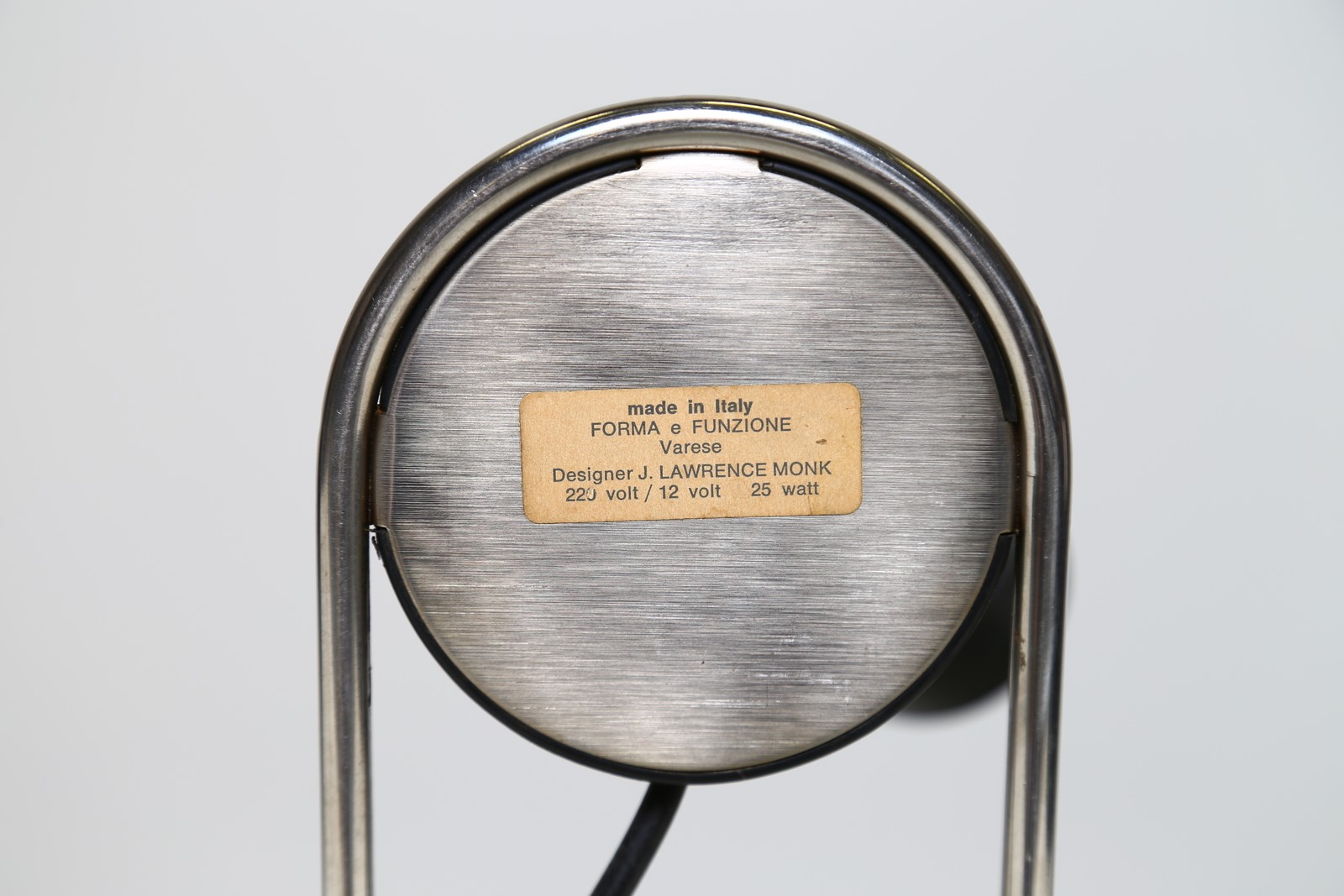 MONK LAWRENCE Lampada da tavolo. Acciaio e plastica. Cm 18,00 x 32,00 x 11,00. Per Forma e Funzione, Varese, etichetta dell'azienda produttrice sotto la base, anni 70.