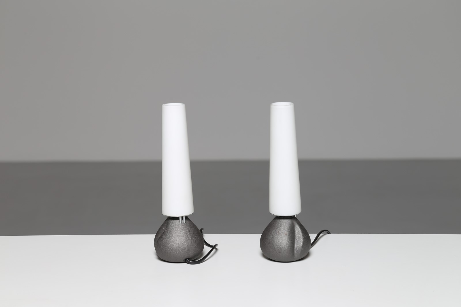 VIABIZZUNO Pair of table lamp mod. Mon amour. . Cm 8,00 x 25,00 x 8,00. Base in painted cast iron and hand-blown, hand-blown glass diffuser. Company brand under the base, 1996. Working.