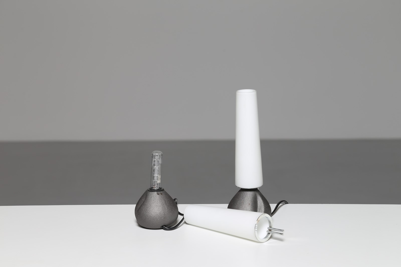 VIABIZZUNO Coppia di lampade da tavolo mod. Mon amour. Ghisa e vetro. Cm 8,00 x 25,00 x 8,00. Base in fusione di ghisa verniciata e diffusore in vetro incamiciato, soffiato e lavorato a mano. Marchio dell'azienda sotto la base, 1996. Funzionante.