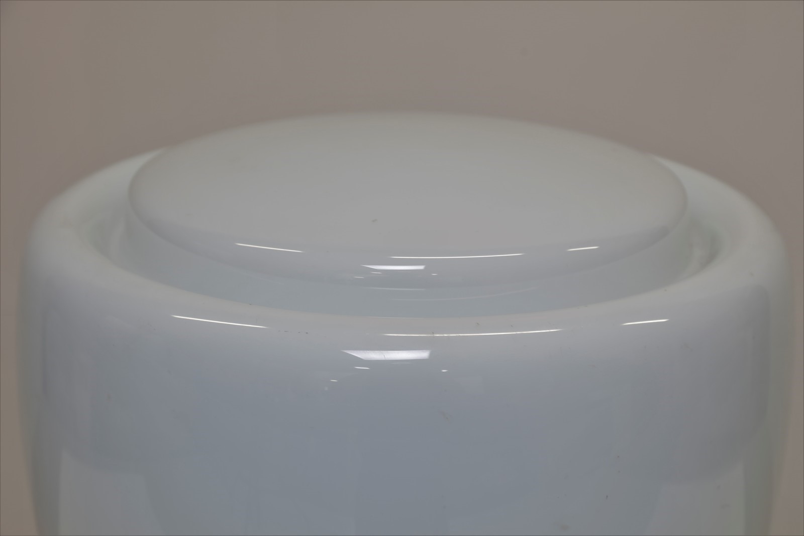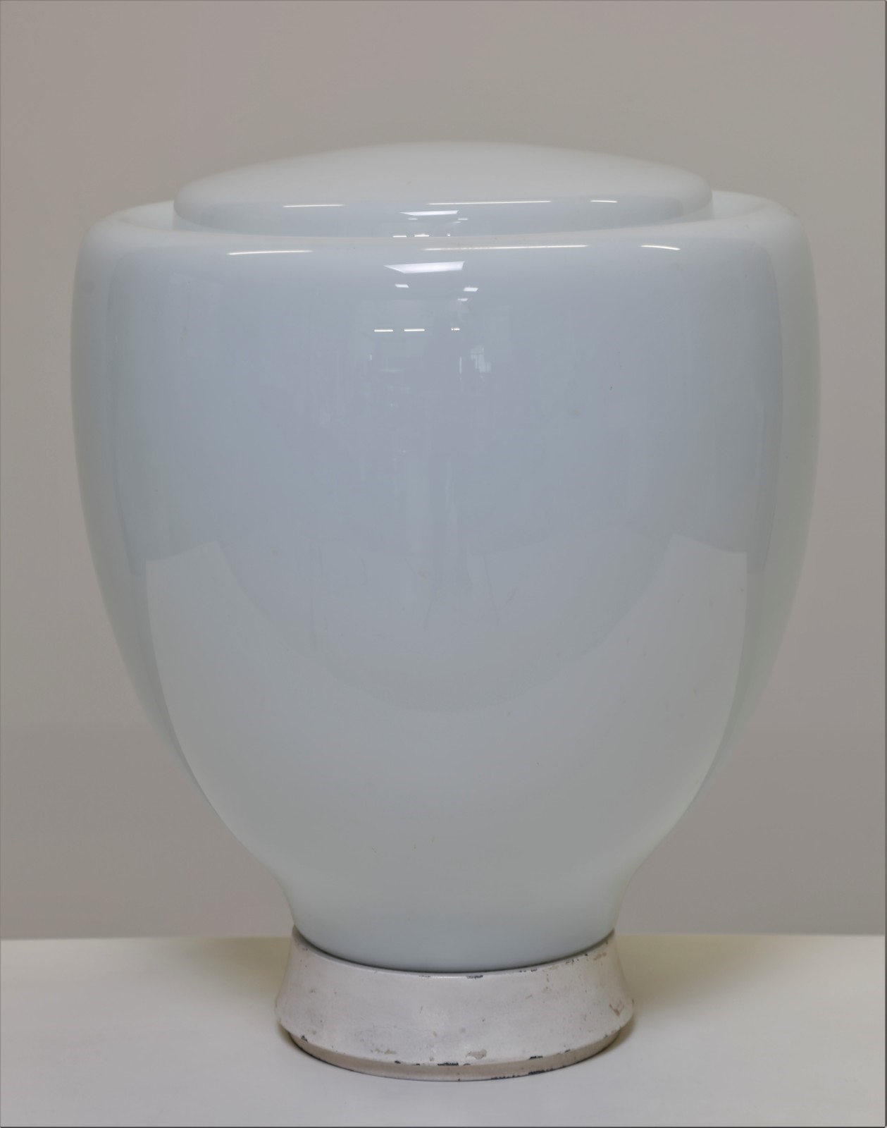 SALOCCHI CLAUDIO (1934 - 2009) Lampada da tavolo. Vetro e metallo laccato. Cm 38,00 x 55,00 x 38,00. Base in metallo laccato bianco e paralume in vetro palino, per Lumenform,1968.