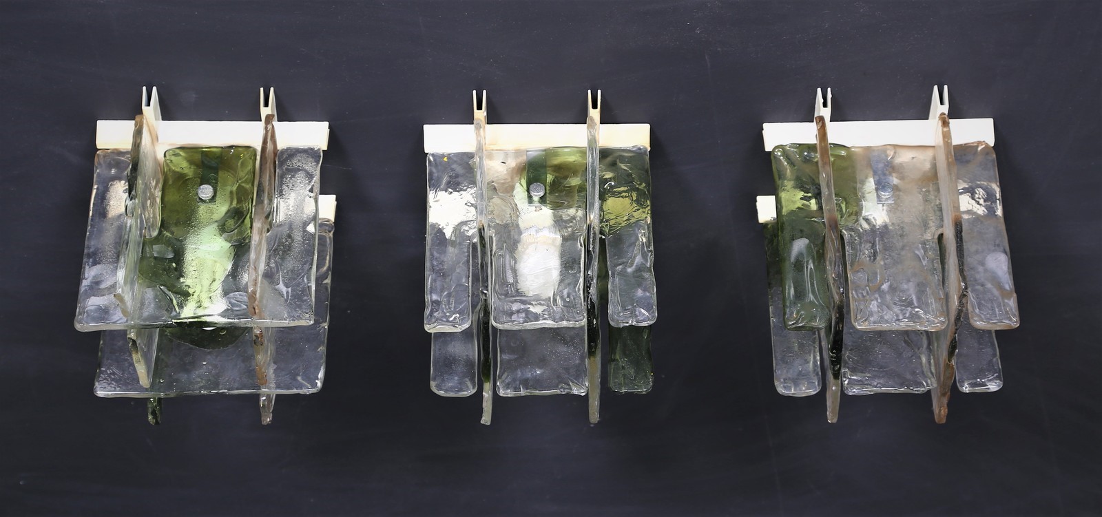 NASON CARLO (n. 1936) Three wall / ceiling lamps. Murano glass. Cm 18,00 x 20,00 x 18,00. Composed of three slabs of colored and interlocking Murano glass. For Mazzega, 60s.
