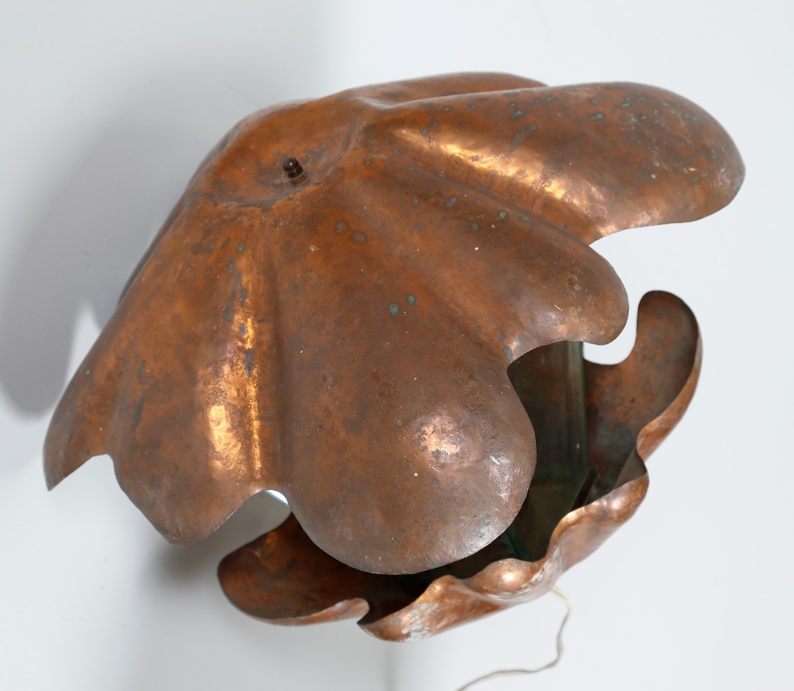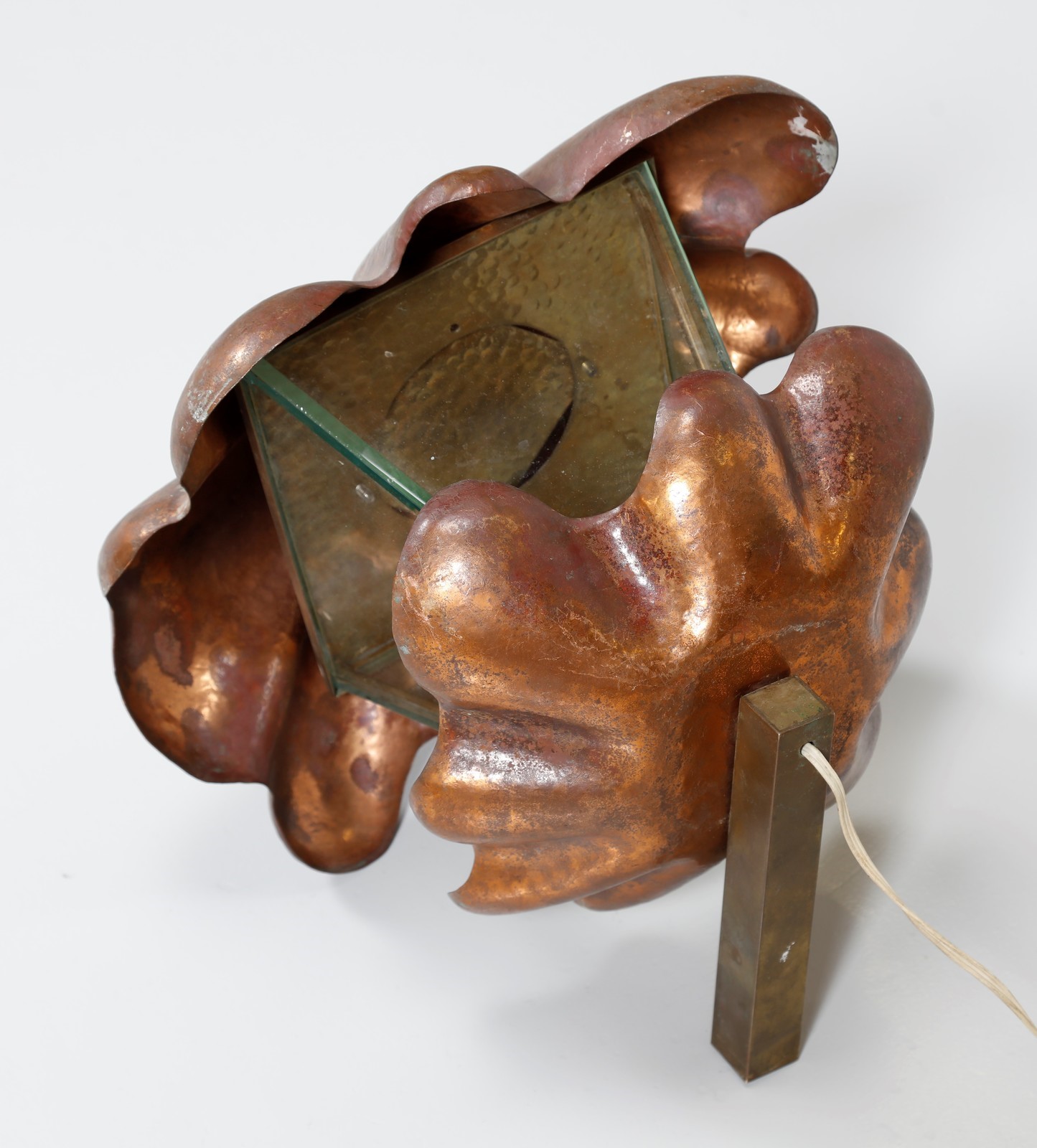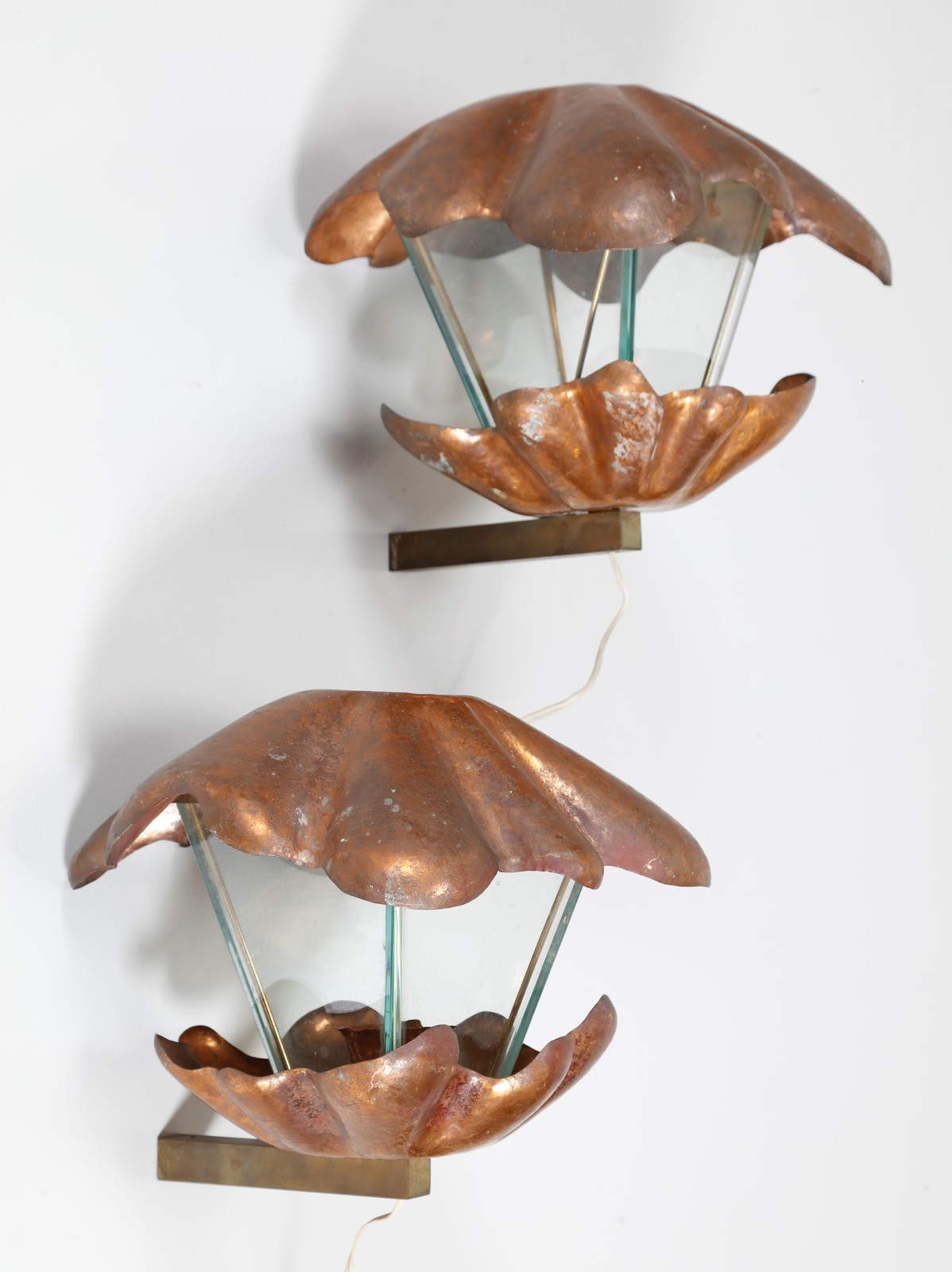 BRAGALINI ANGELO (n. 1913) Coppia di appliques. Ottone, rame e vetro. Cm 30,00 x 30,00 x 30,00.