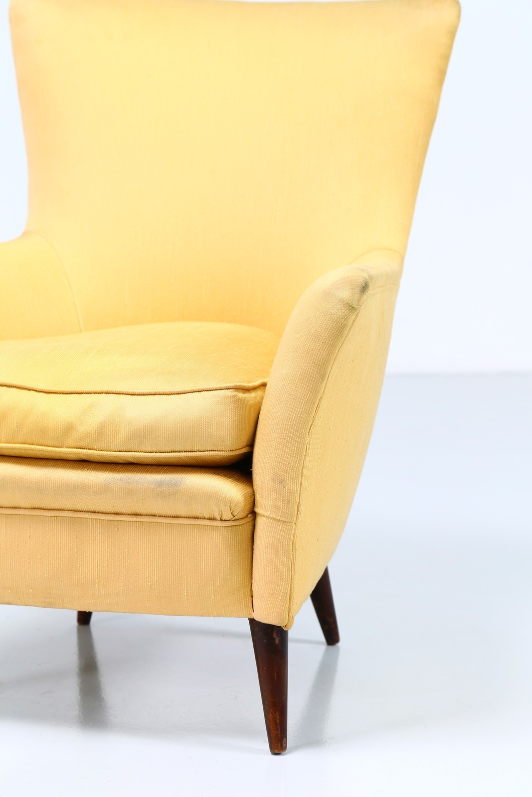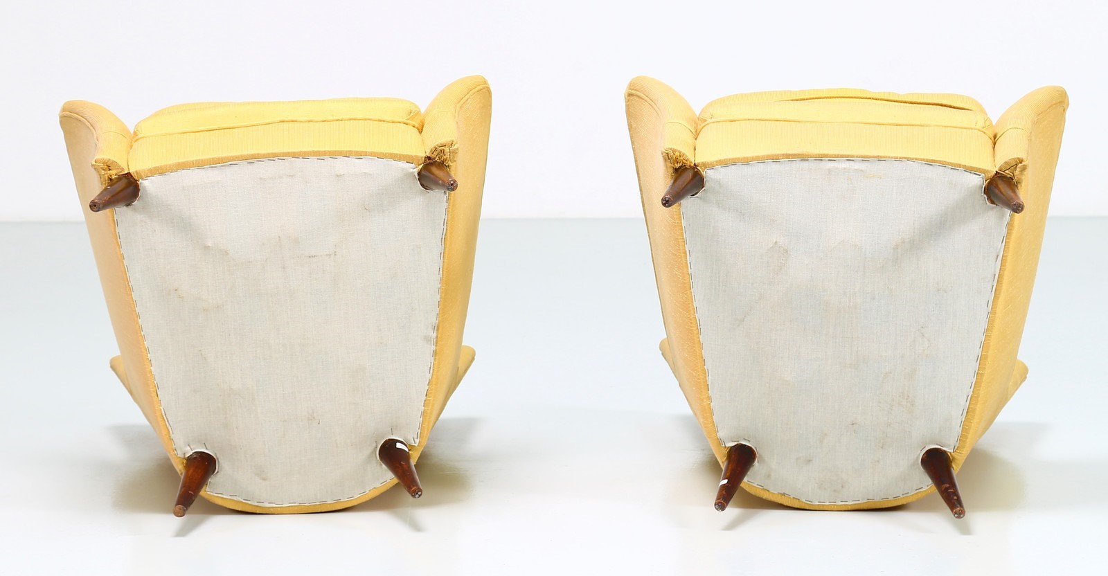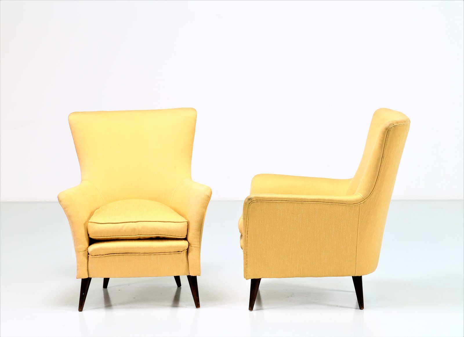 ITALIAN MANUFACTURE Pair of armchairs. Wood and fabric. Cm 71,00 x 88,00 x 78,00. Wooden structure, upholstery and fabric covering, 50s.