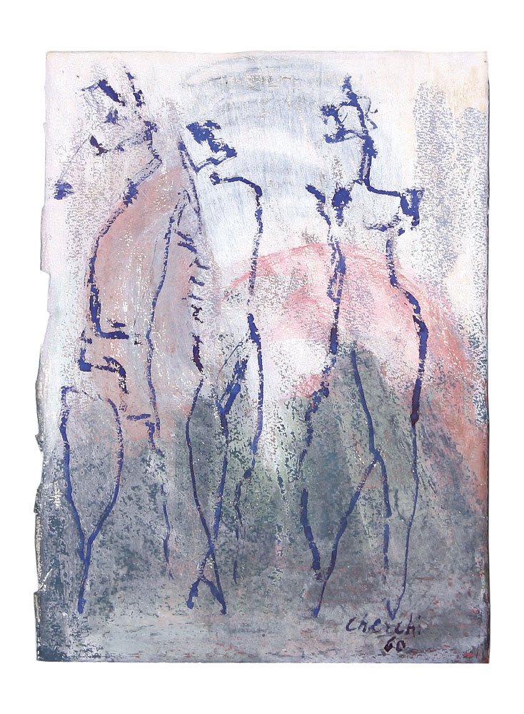 SANDRO CHERCHI Genova 1911 - Torino 1998 Figure, 1960 tecnica mista su carta cm. 34,5x24,5; firma e anno in basso a destra, presenta leggere mancanze sul margine sinistro.