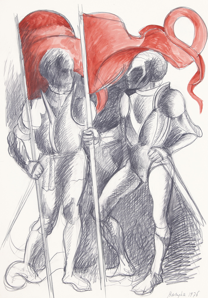 VITTORIO BASAGLIA Venezia 19/08/1936 - 2005 Sbandieratori, 1976 tecnica mista su carta cm. 69x49,5; firma e anno in basso a destra.
