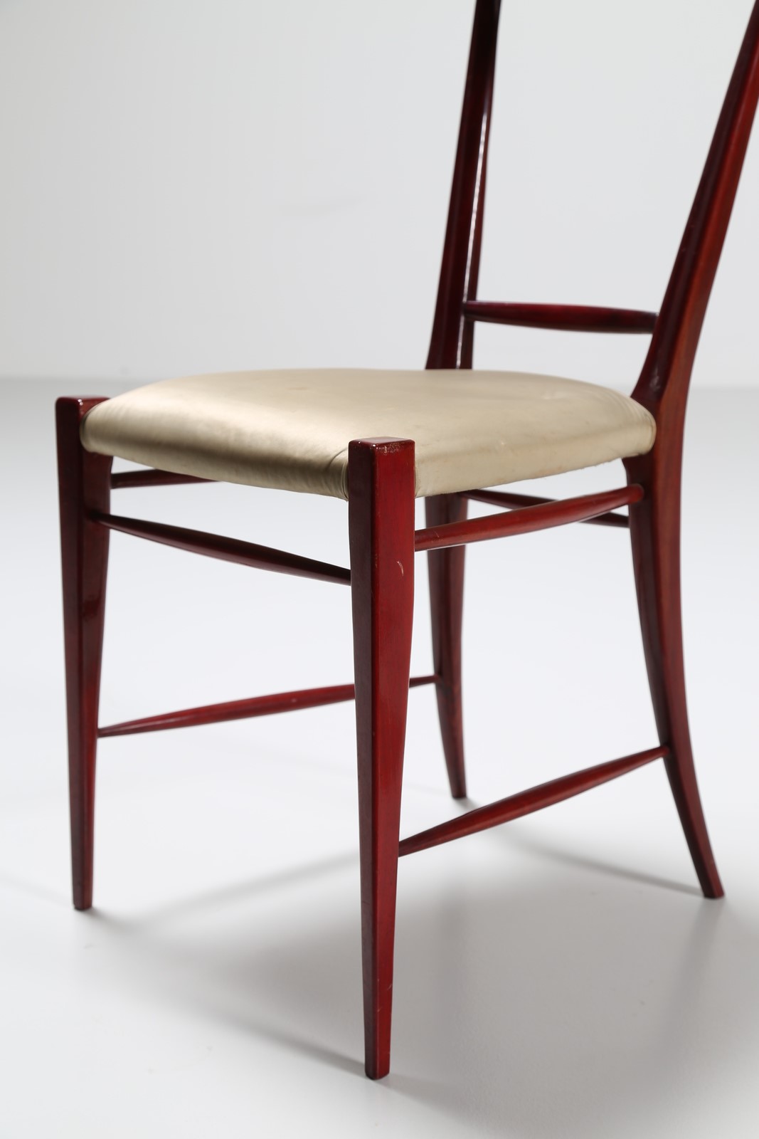 CAVATORTA SILVIO Six chairs. Mahogany and fabric. Cm 52,00 x 96,00 x 54,00. Mahogany wood structure, upholstery and fabric covering. For Cavatorta, 50s.