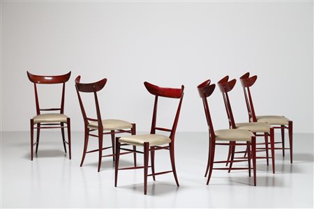 CAVATORTA SILVIO Sei sedie. Legno di mogano e tessuto. Cm 52,00 x 96,00 x...