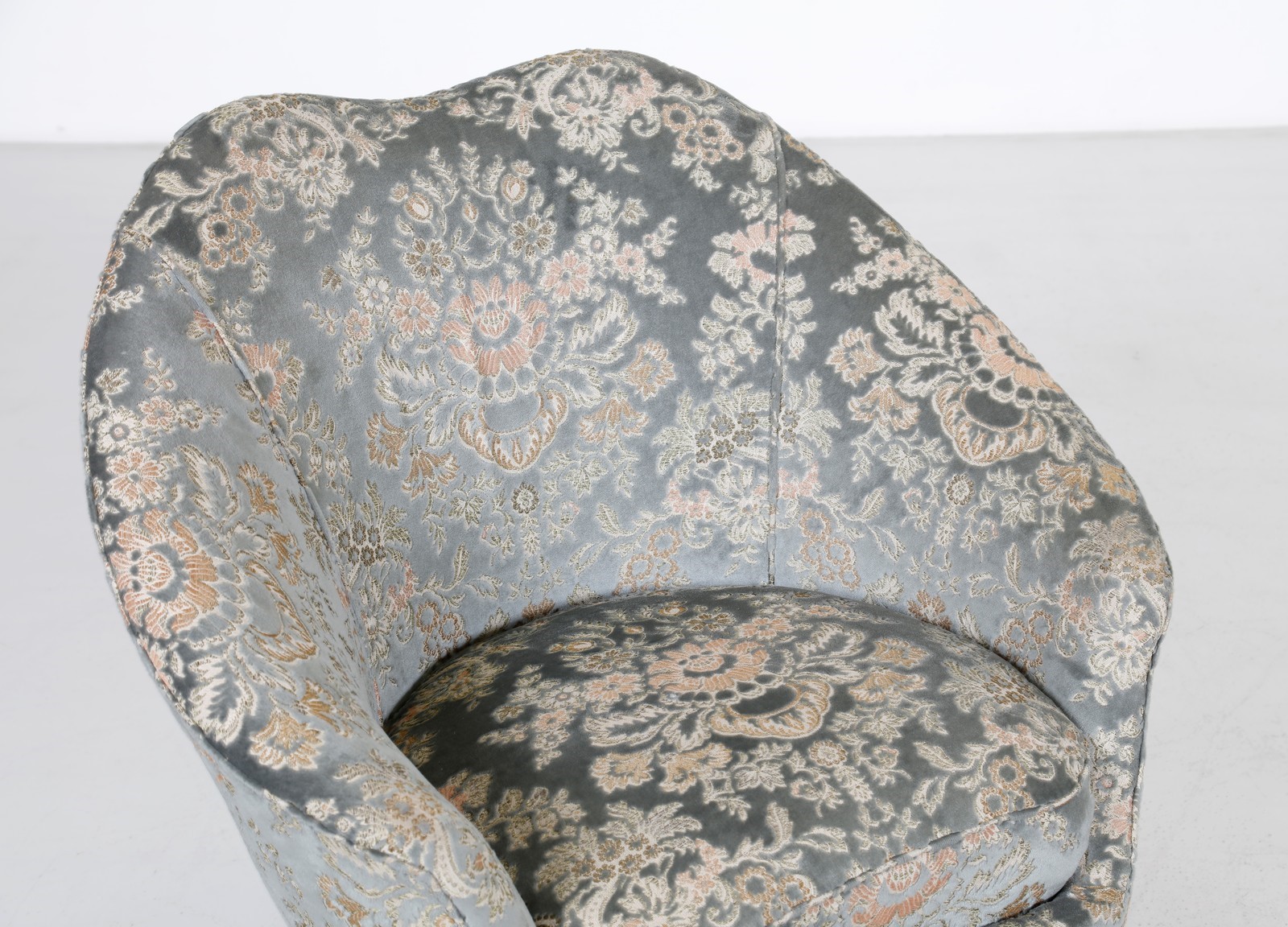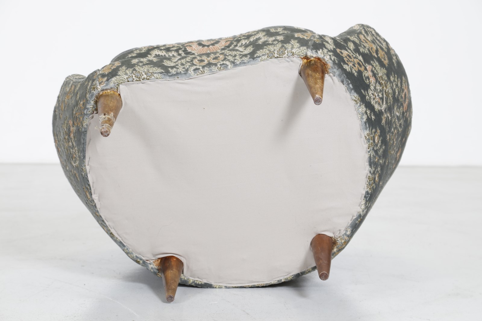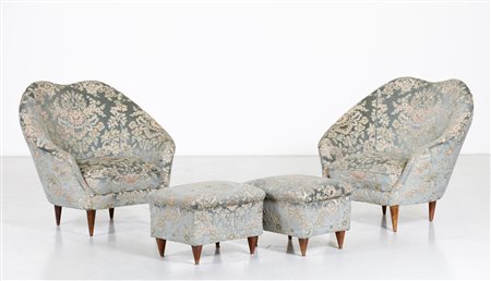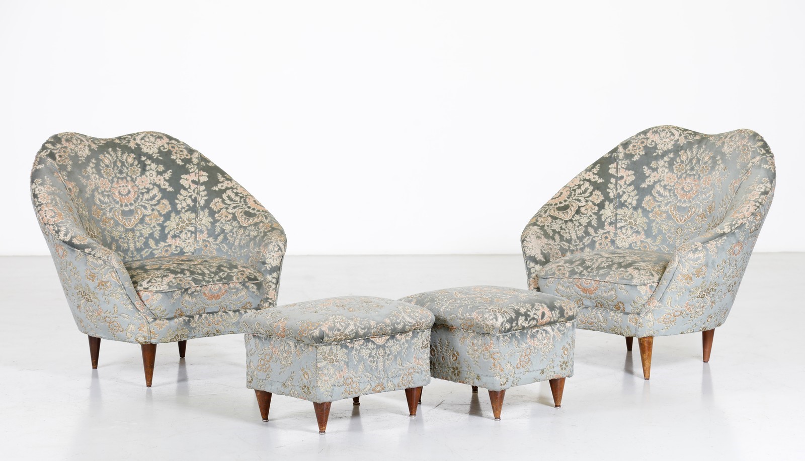 ISA BERGAMO Pair of armchairs with pouf. Wood and fabric. Cm 87,00 x 79,00 x 74,00. Wooden frame, padding and cover in damask fabric. 40s. Ottoman size: H 36 cm x L 50 cm x L 40 cm