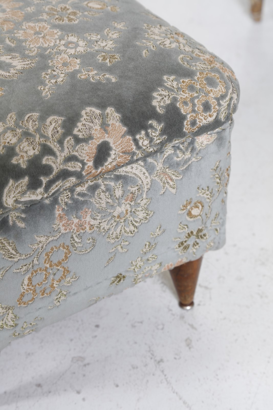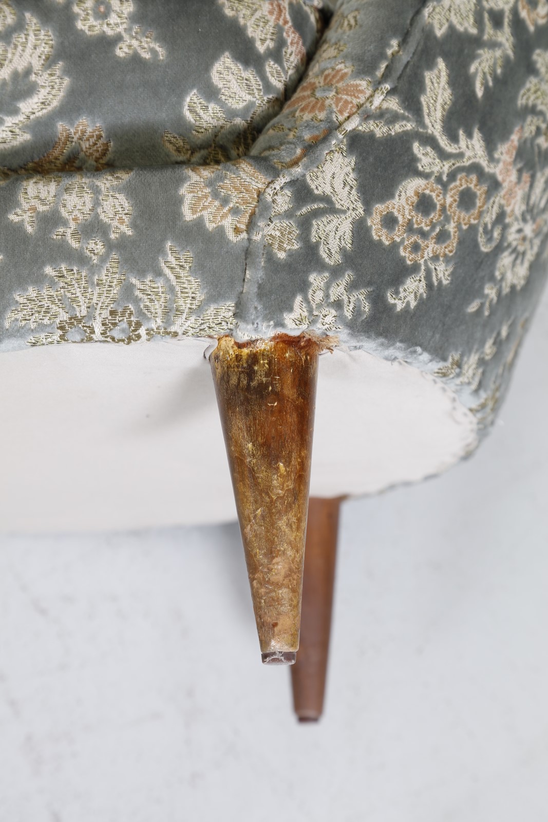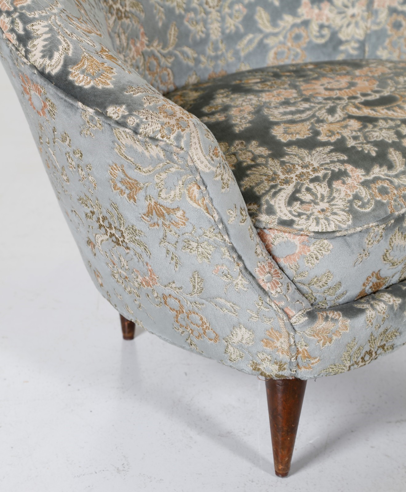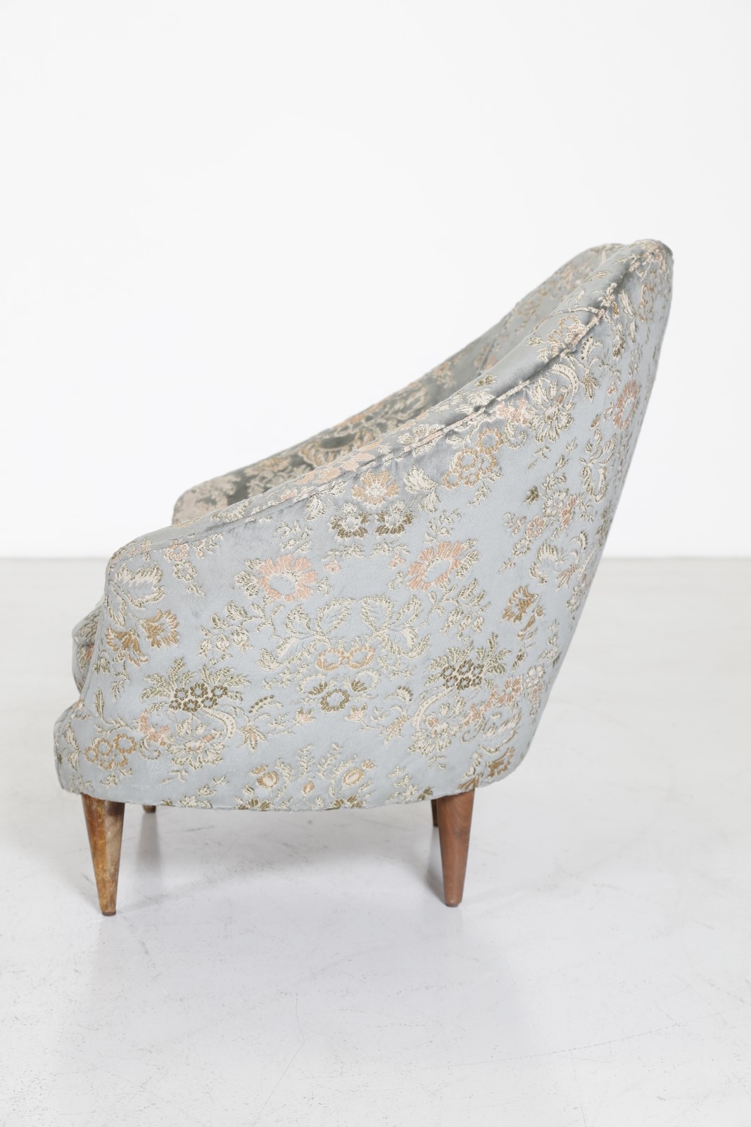 ISA BERGAMO Pair of armchairs with pouf. Wood and fabric. Cm 87,00 x 79,00 x 74,00. Wooden frame, padding and cover in damask fabric. 40s. Ottoman size: H 36 cm x L 50 cm x L 40 cm