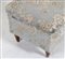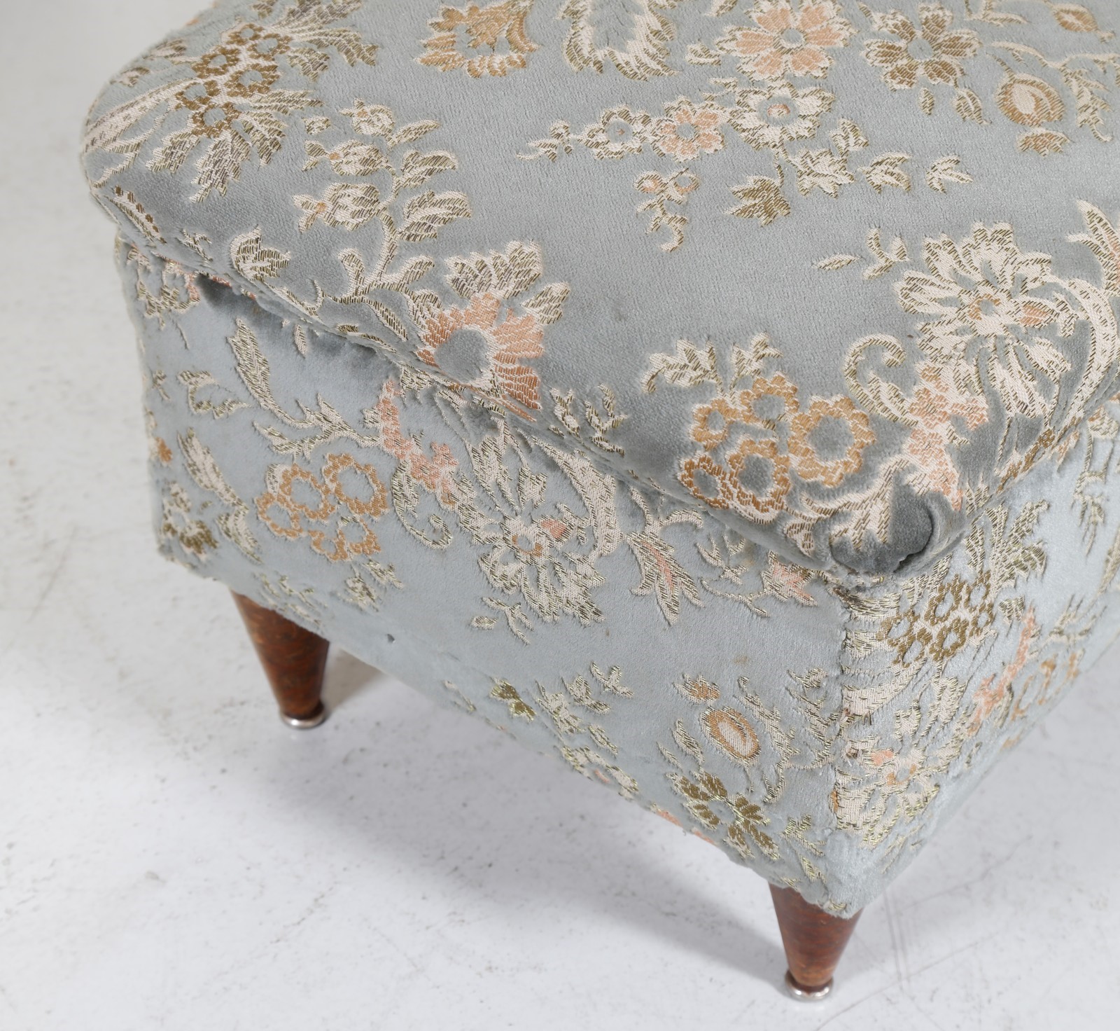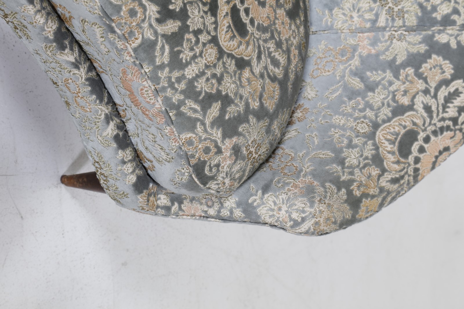 ISA BERGAMO Coppia di poltrone con pouf. Legno e tessuto. Cm 87,00 x 79,00 x 74,00. Struttura in legno, imbottitura e rivestimento in tessuto damascato. Anni 40. Misura pouf: H 36 cm x L 50 cm x L 40 cm