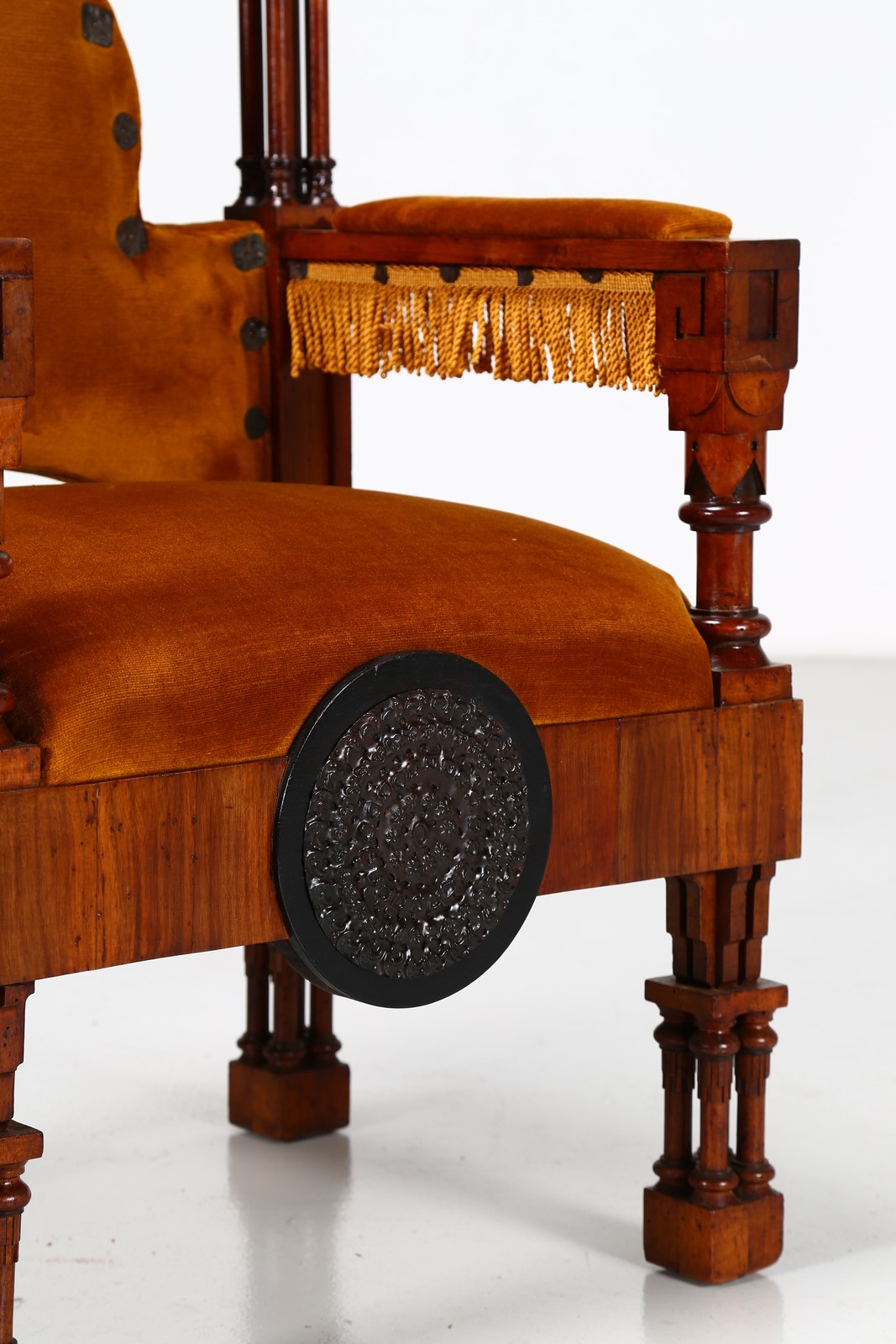 BUGATTI CARLO Attrib. Trono. Legno di noce e tessuto. Cm 60,00 x 100,00 x...
