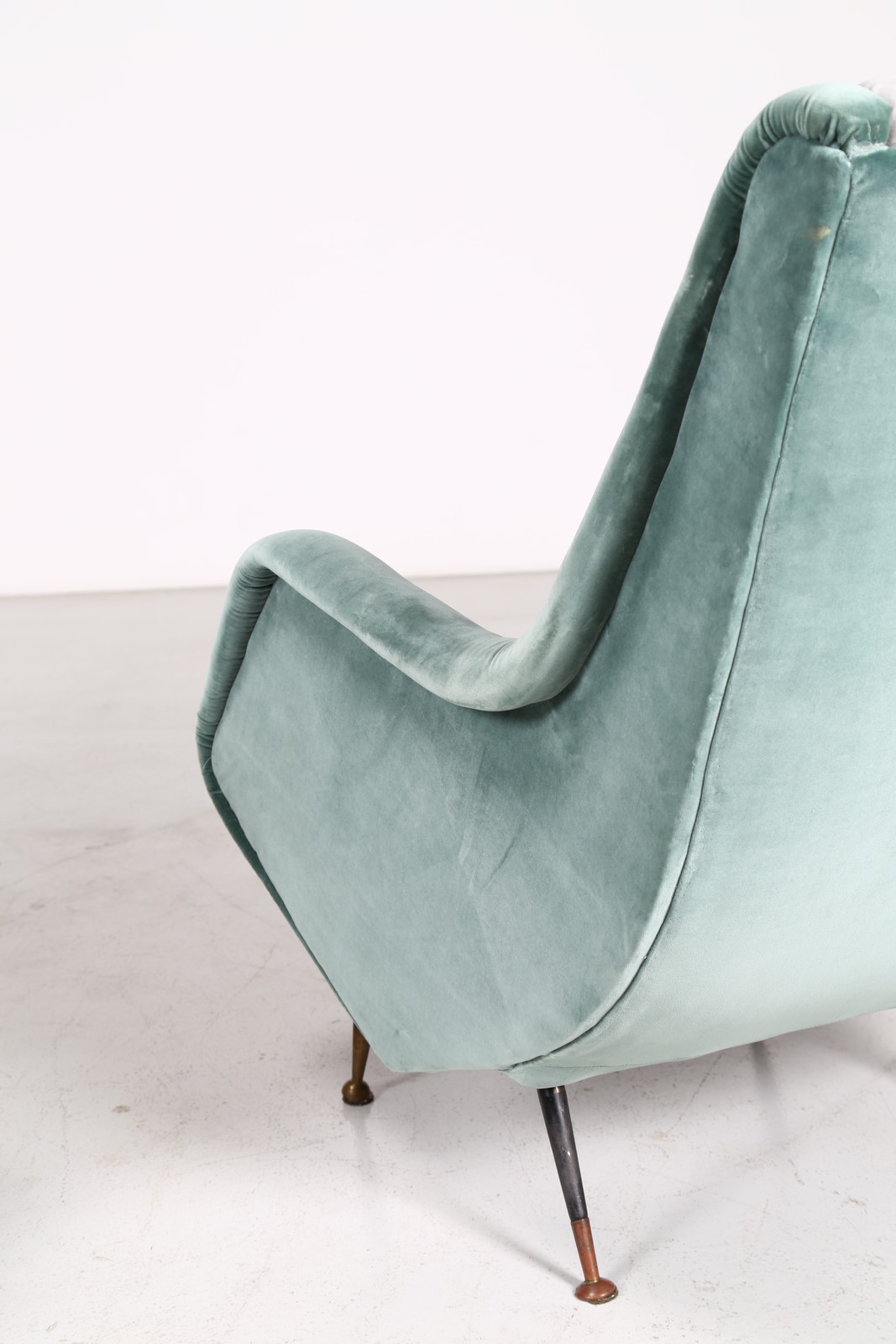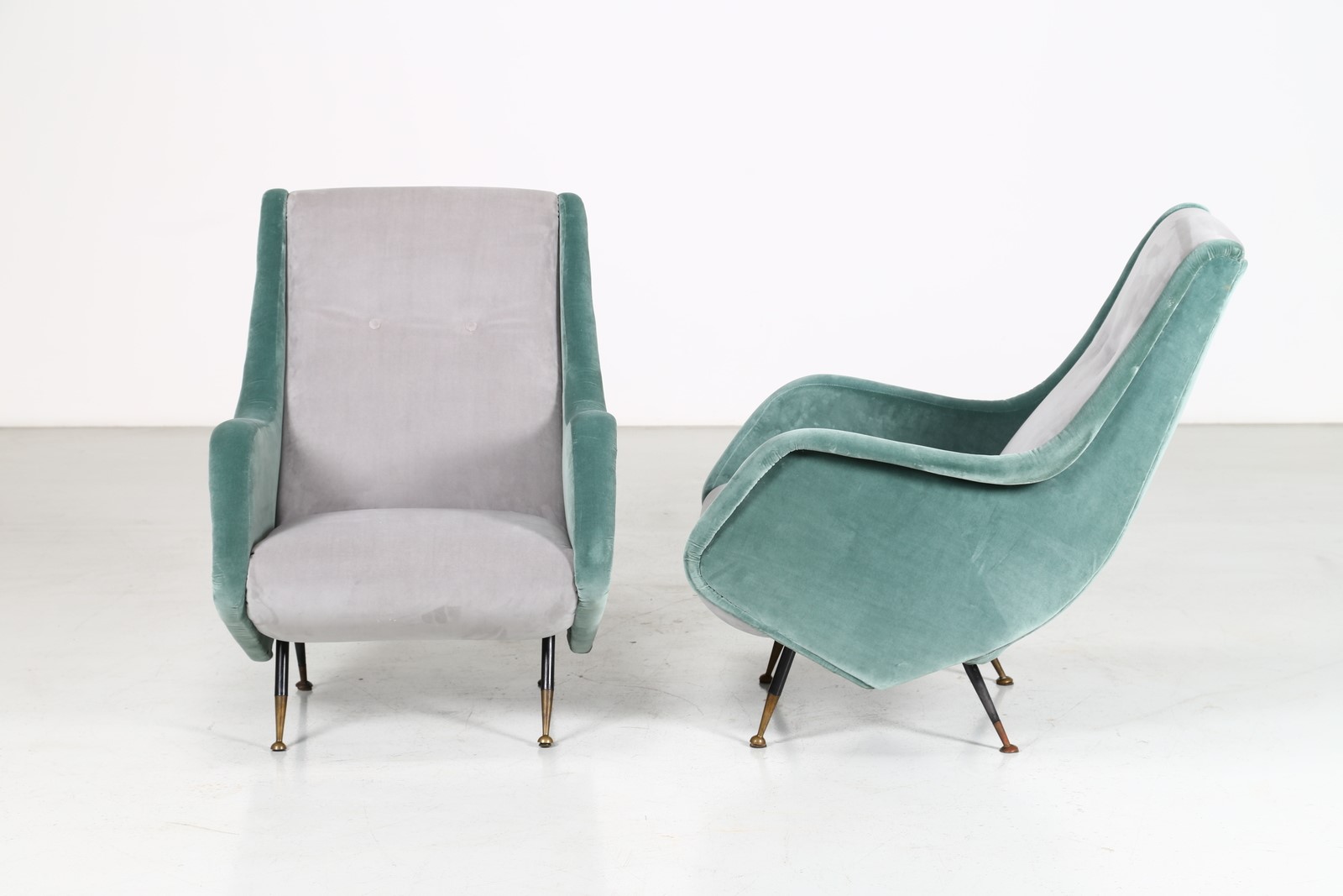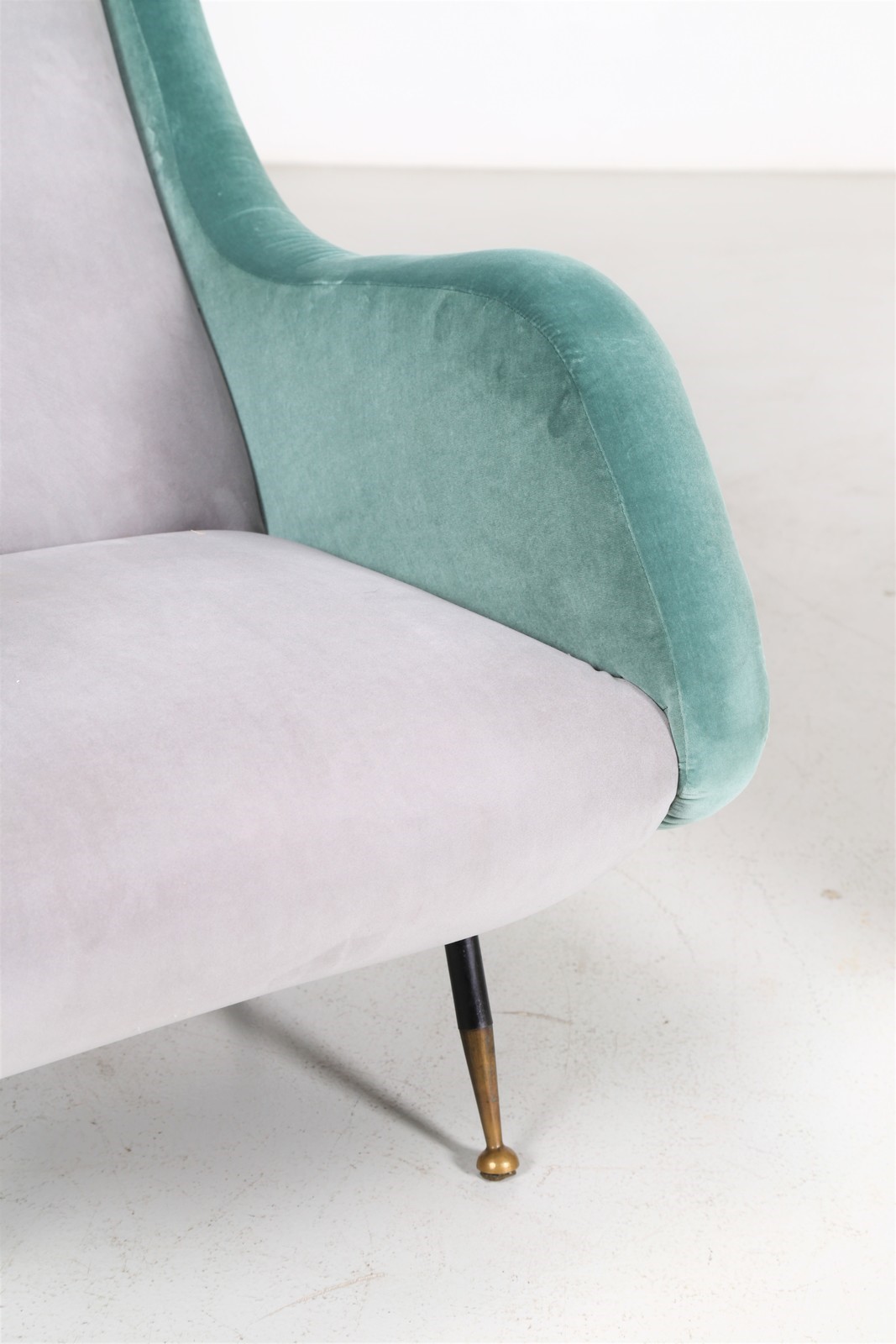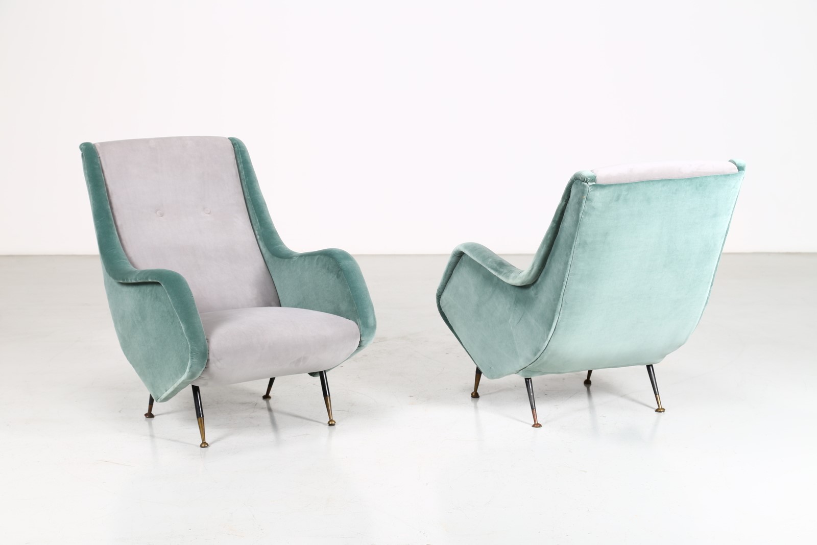 ALDO MORBELLI Pair of armchairs. . Cm 66,00 x 86,00 x 90,00. Fabric, brass and lacquered metal, Isa Bergamo production, 50s.