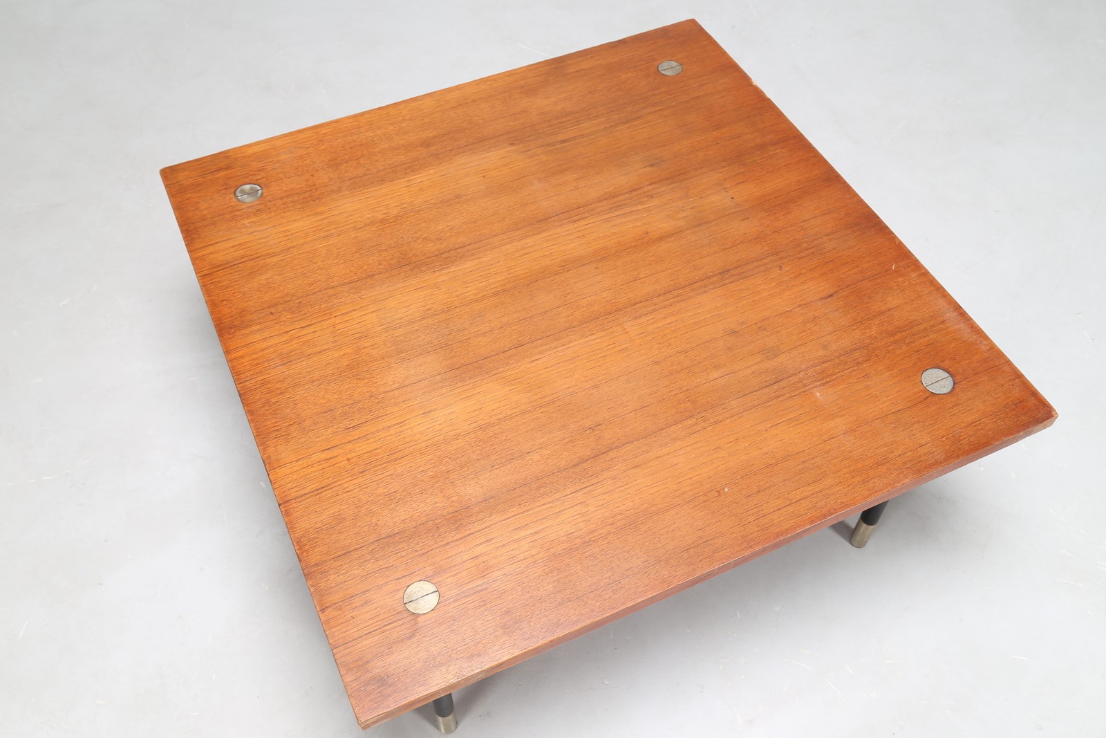 ITALIAN MANUFACTURE Coffee table. Plywood and metal. Cm 75,00 x 35,00 x 75,00. Base in chromed and lacquered metal, top in teak wood. 50s.