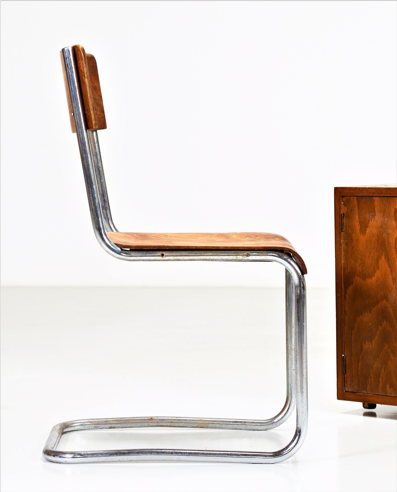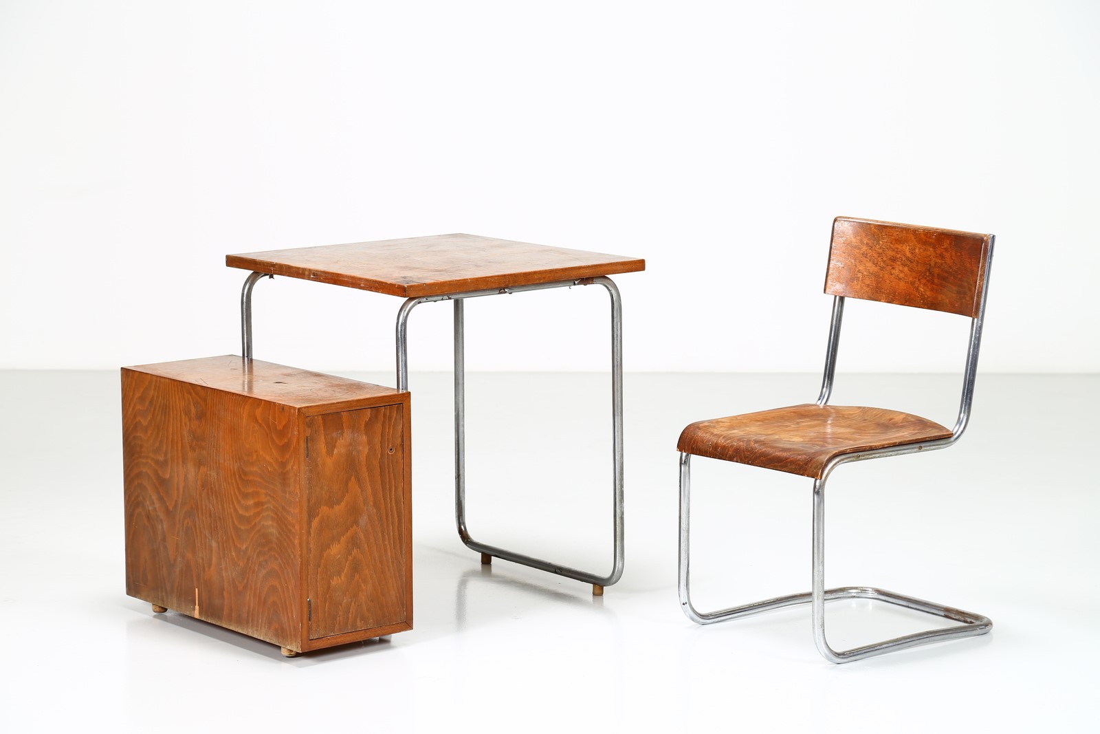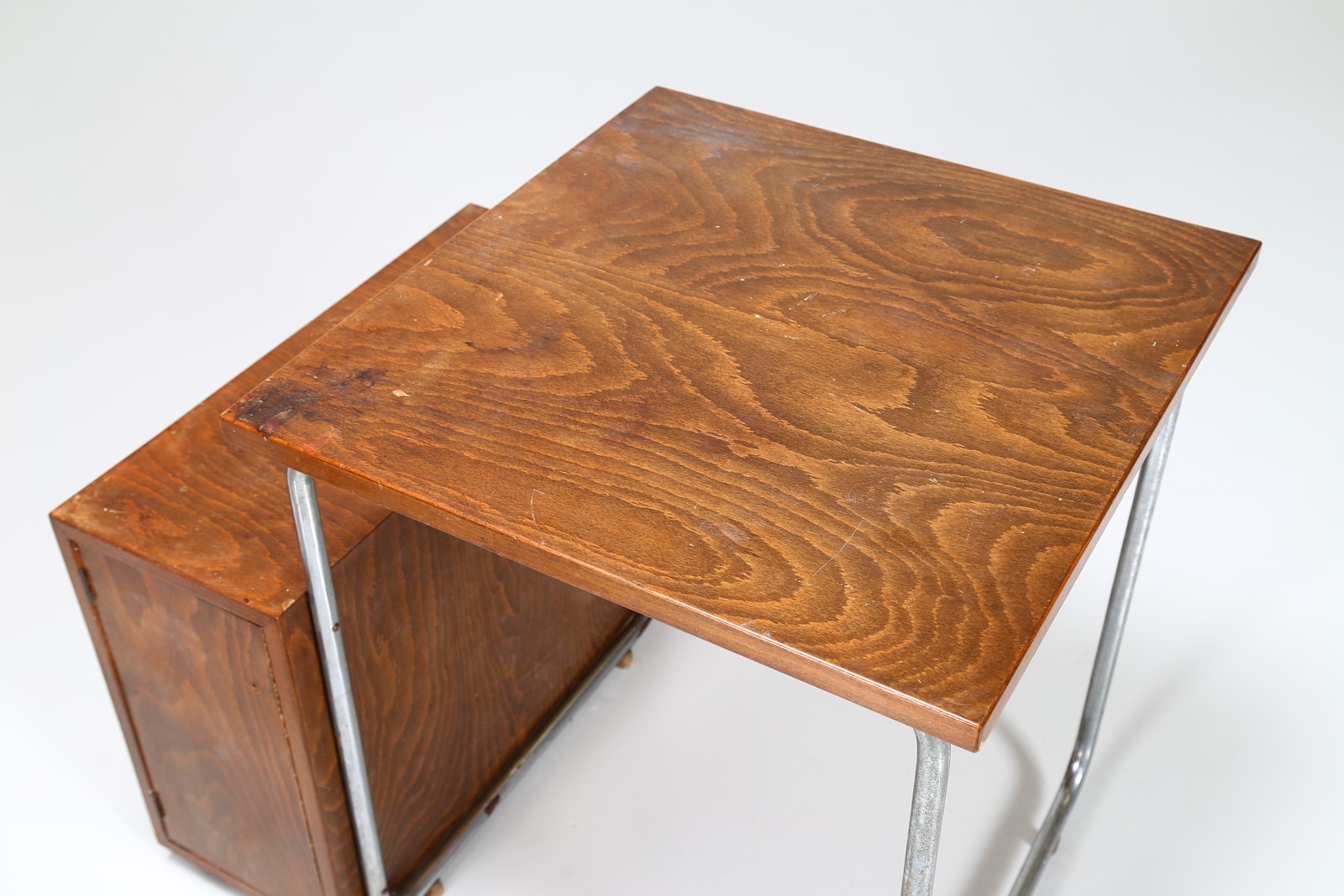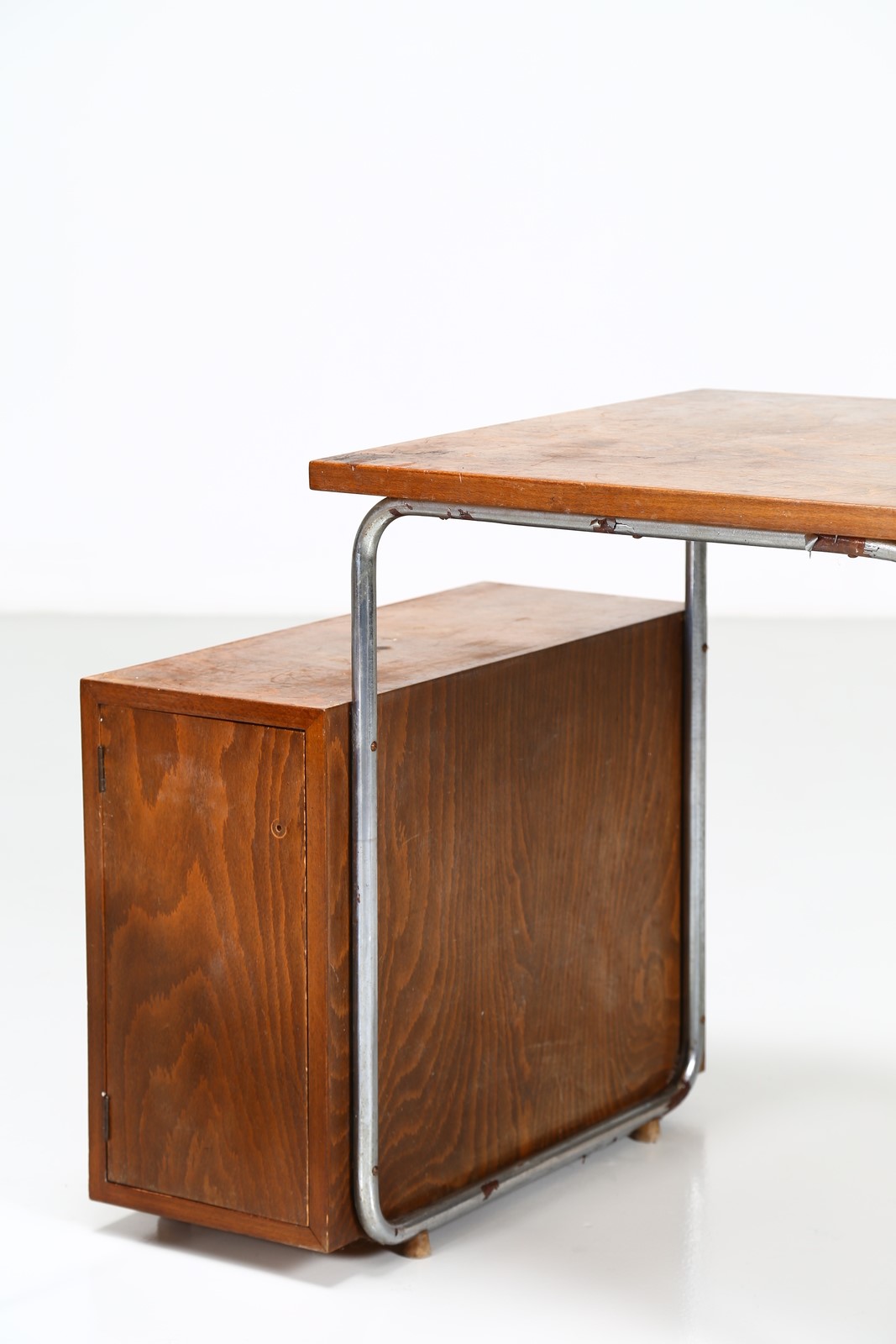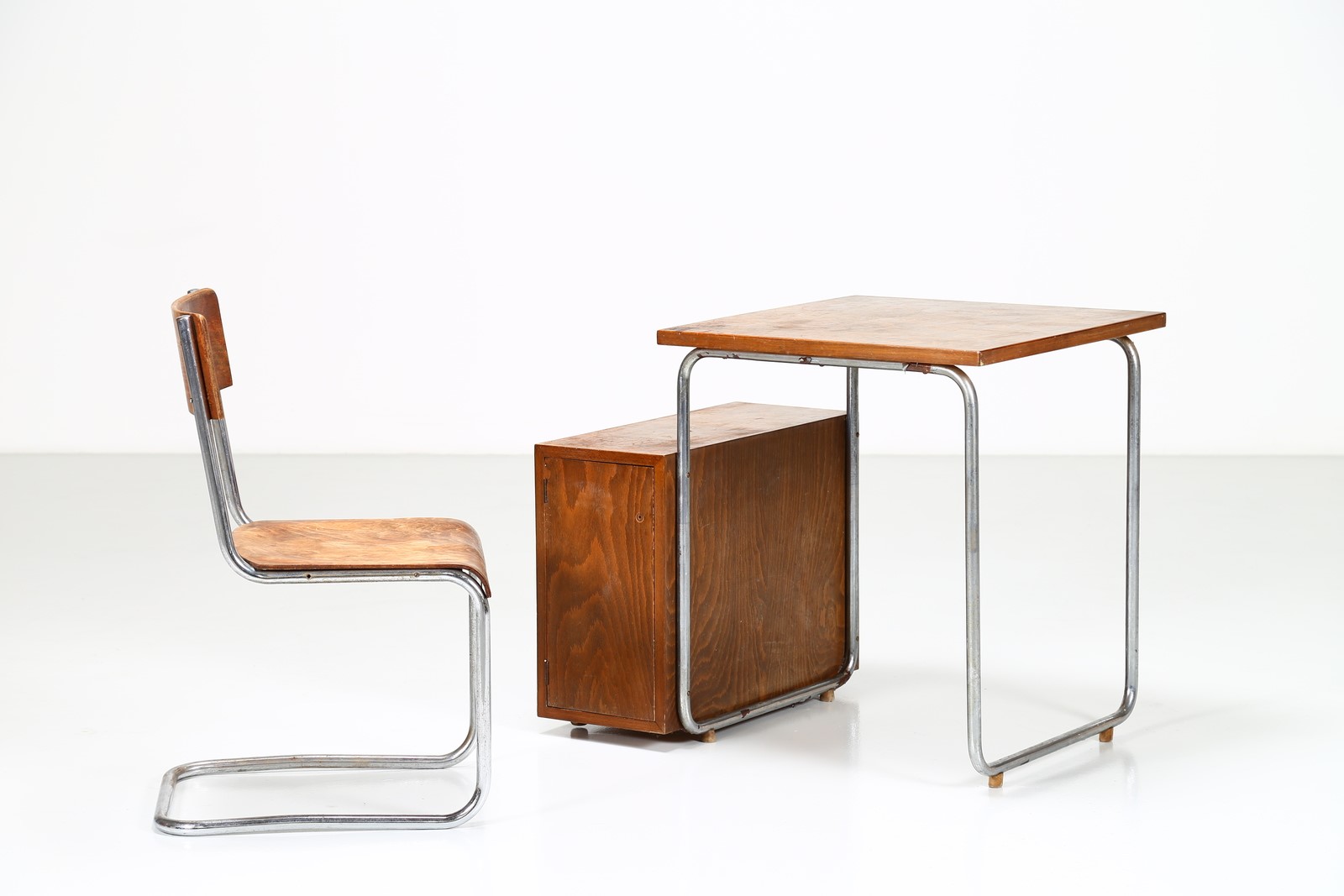 COVA MILANO Desk and chair. Wood and chromed metal. Cm 85,00 x 70,00 x 62,00. Structure in chromed metal and wooden tubular, 50s.