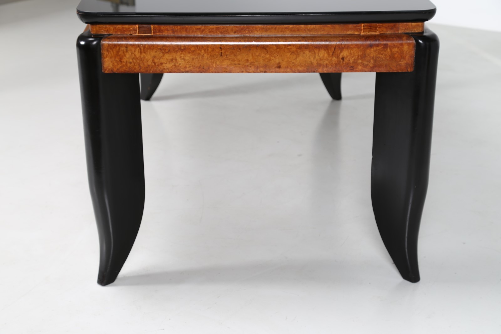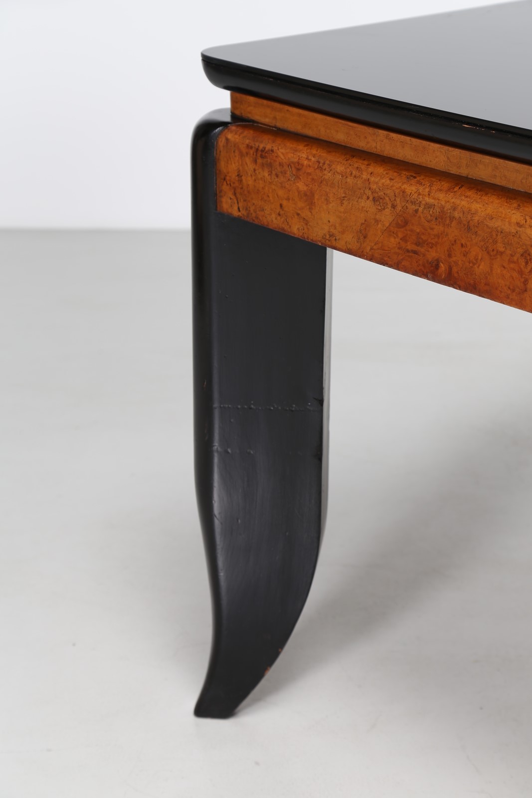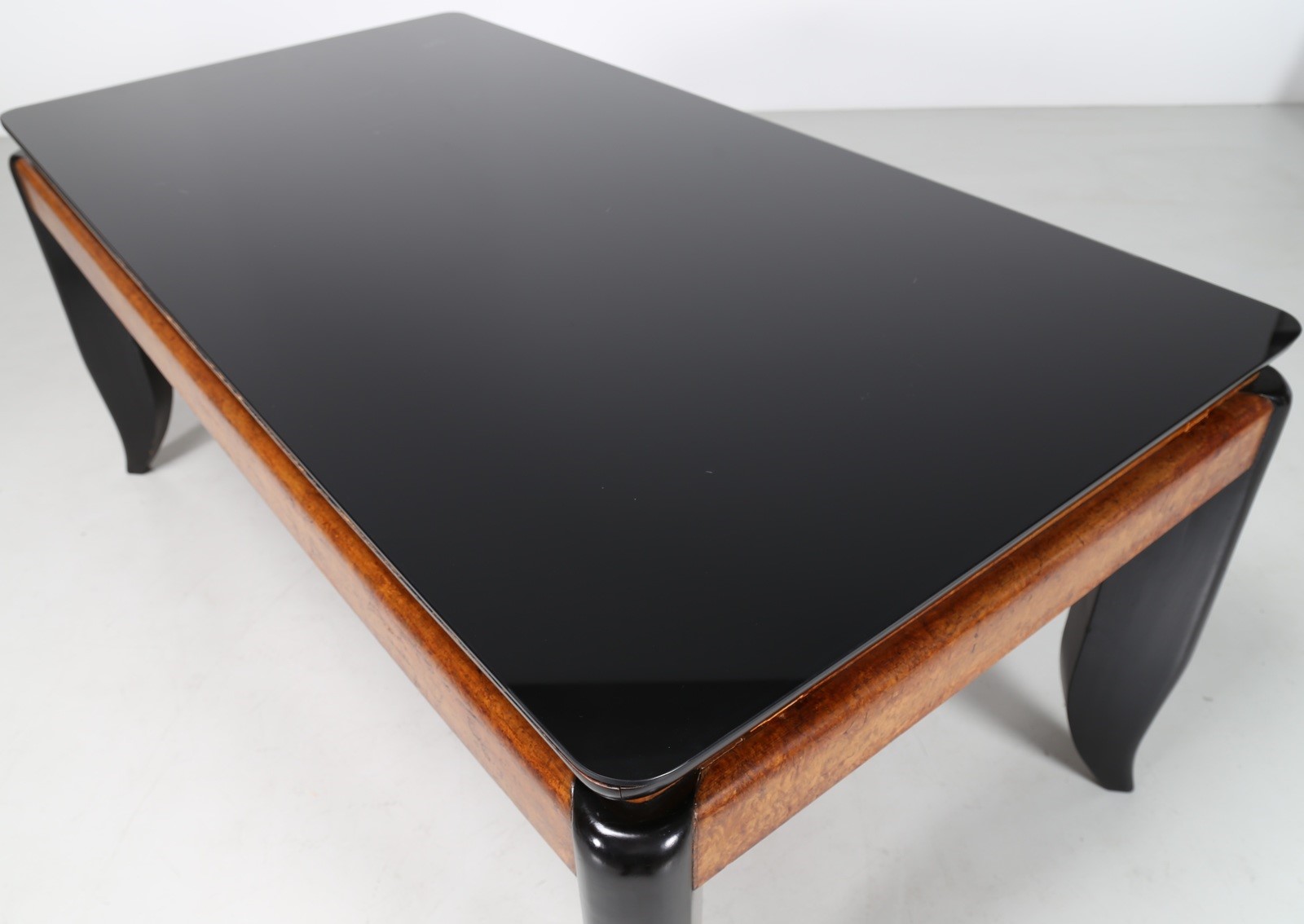 MANIFATTURA ITALIANA Tavolo. Legno e vetro. Cm 186,00 x 83,00 x 96,00. Base in legno laccato, piano in radica e vetro opalino scuro. Anni 70.