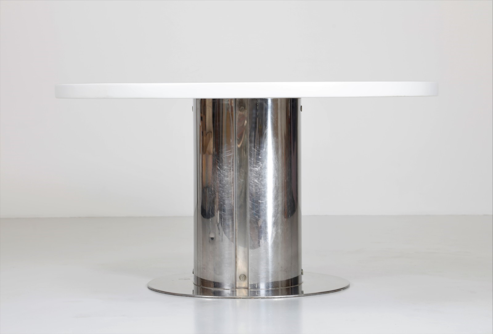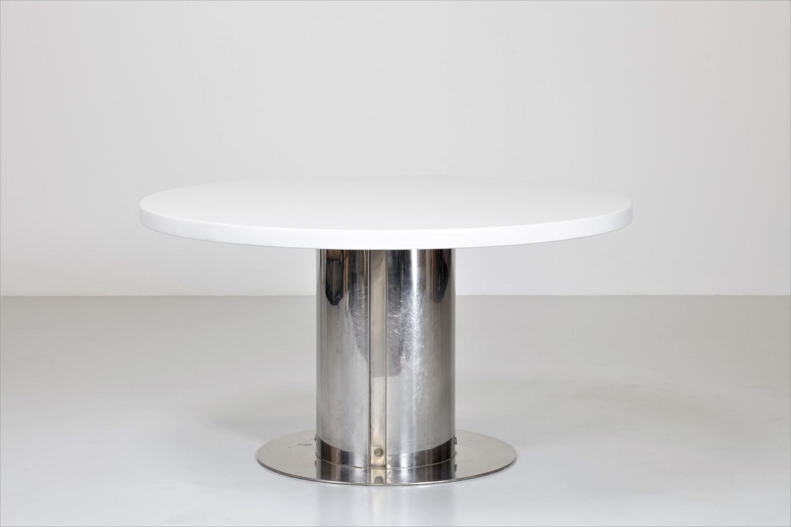 ANTONIA ASTORI (n. 1940) Tavolo. Metallo cromato e legno laccato. Cm 139,50 x 75,00 x 139,50. Base in metallo cromato, piano in legno laccato. Modello Cidonio, per Driade, 1968. Pubblicazioni: Domus, n. 475, giugno 1969, p. 16