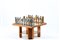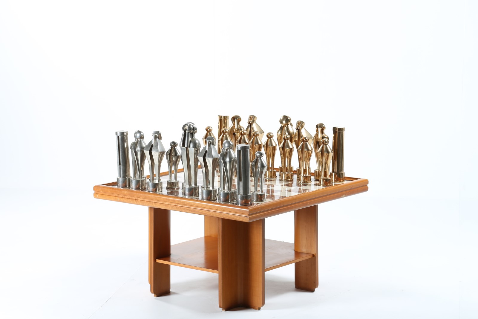 ROCCAMONTE AMELIO (n. 1927) Checkerboard and chess table. Wood marble brass.. Cm 109,00 x 62,00 x 109,00. Marble and chess top in gilded and chrome-plated brass. Chess is performed by Gianfranco Frattini, producted by Mobilificio Tosi, Rovigo. Size of the chessboard: 62 cm x 109 cm x109 cm. Chess size: queen h 40 cm, king h 35 cm, bishop h 33 cm, horse h cm 32, tower h 31 cm, soldiers h 26 cm.