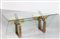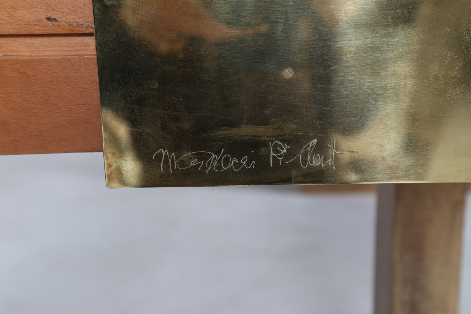 PILLANT MORDECAI Scrivania. Alluminio e vetro. Cm 190,00 x 76,00 x 92,00. Scrivania in alluminio dorato e patinato, cassetti ricoperti a combustione su materiale cartaceo, con piano e raccordo centrale in cristallo, mod. Loviscan, Pezzo unico, Italia 2014