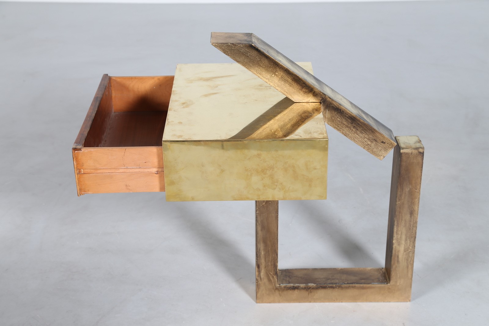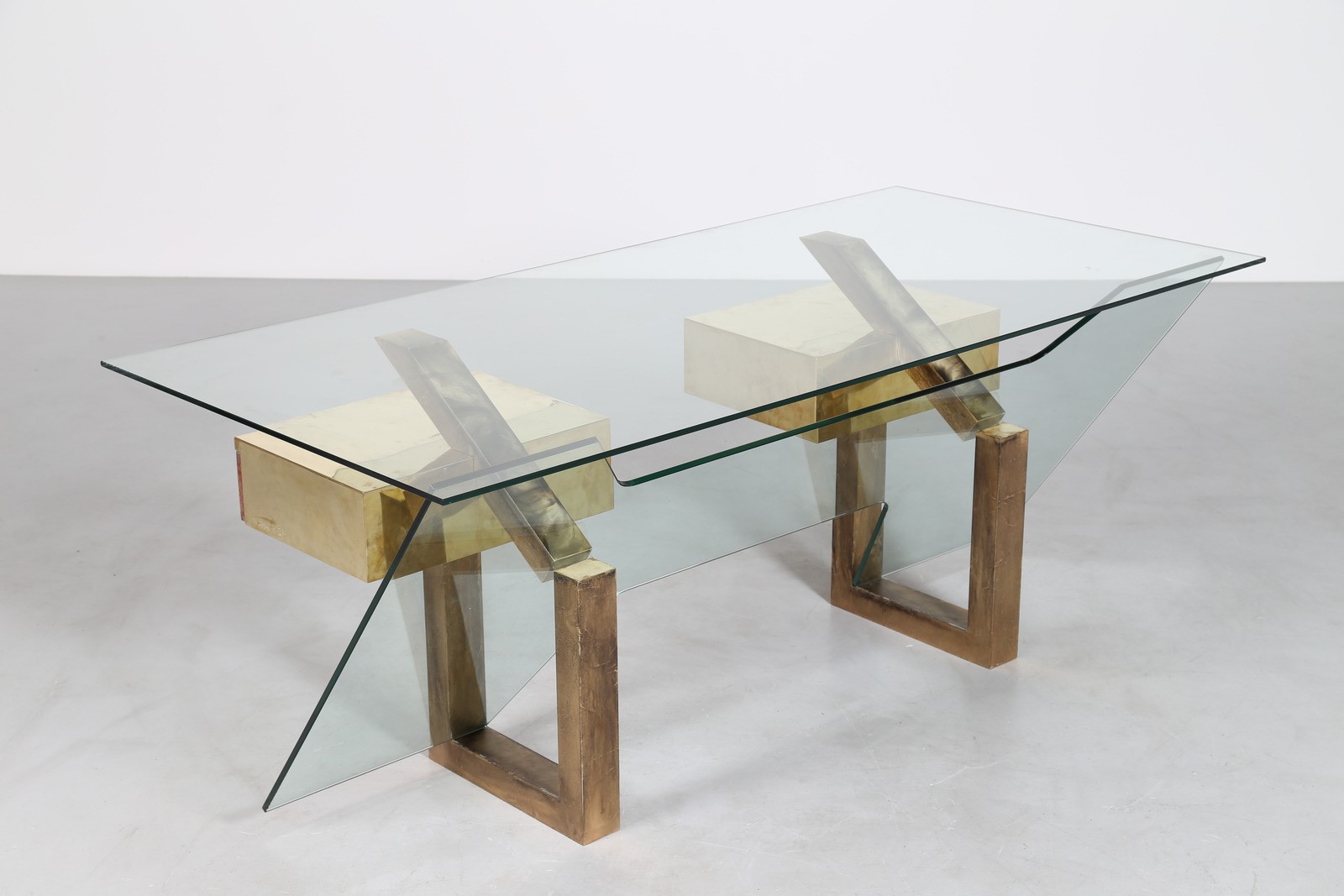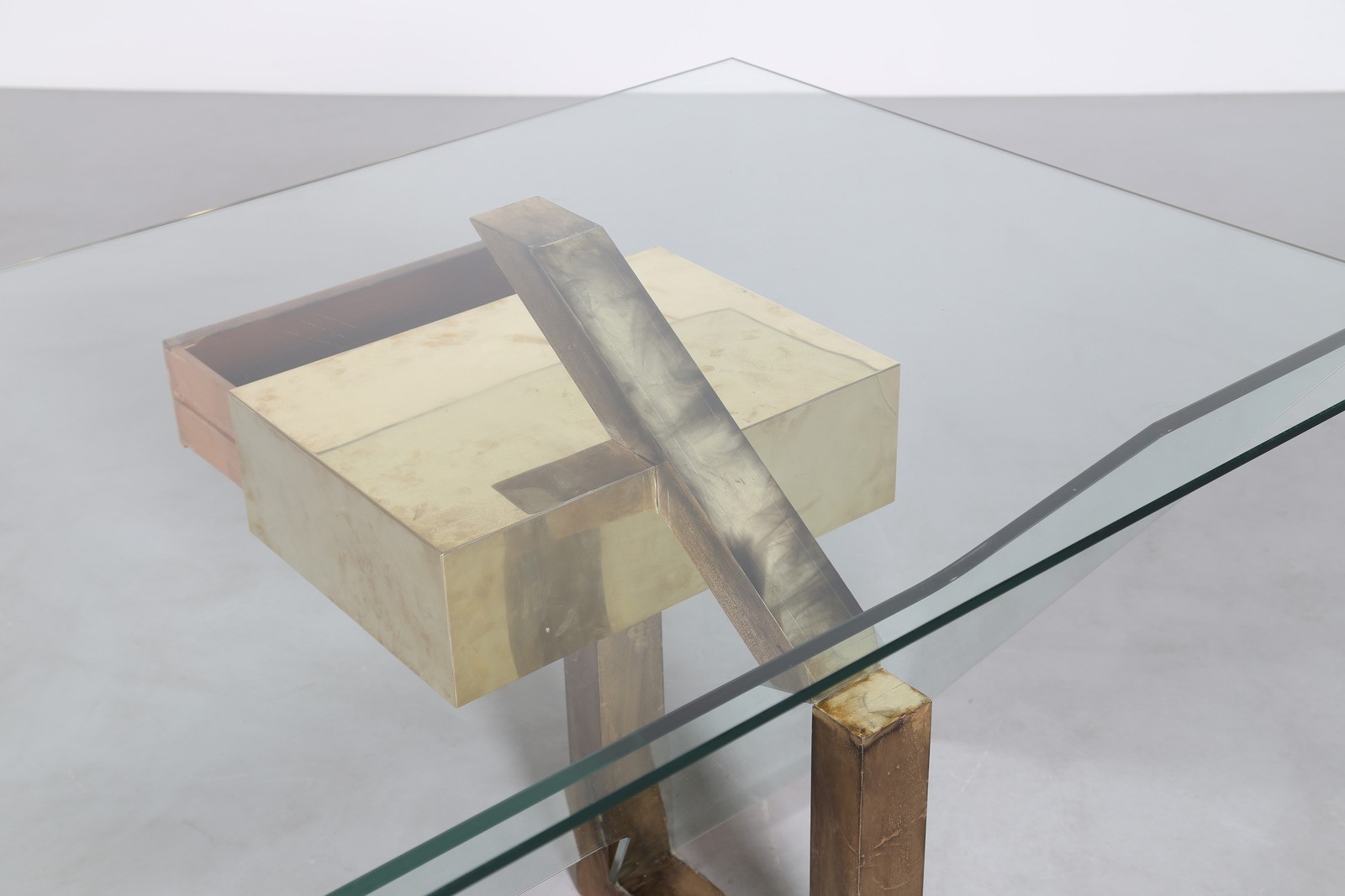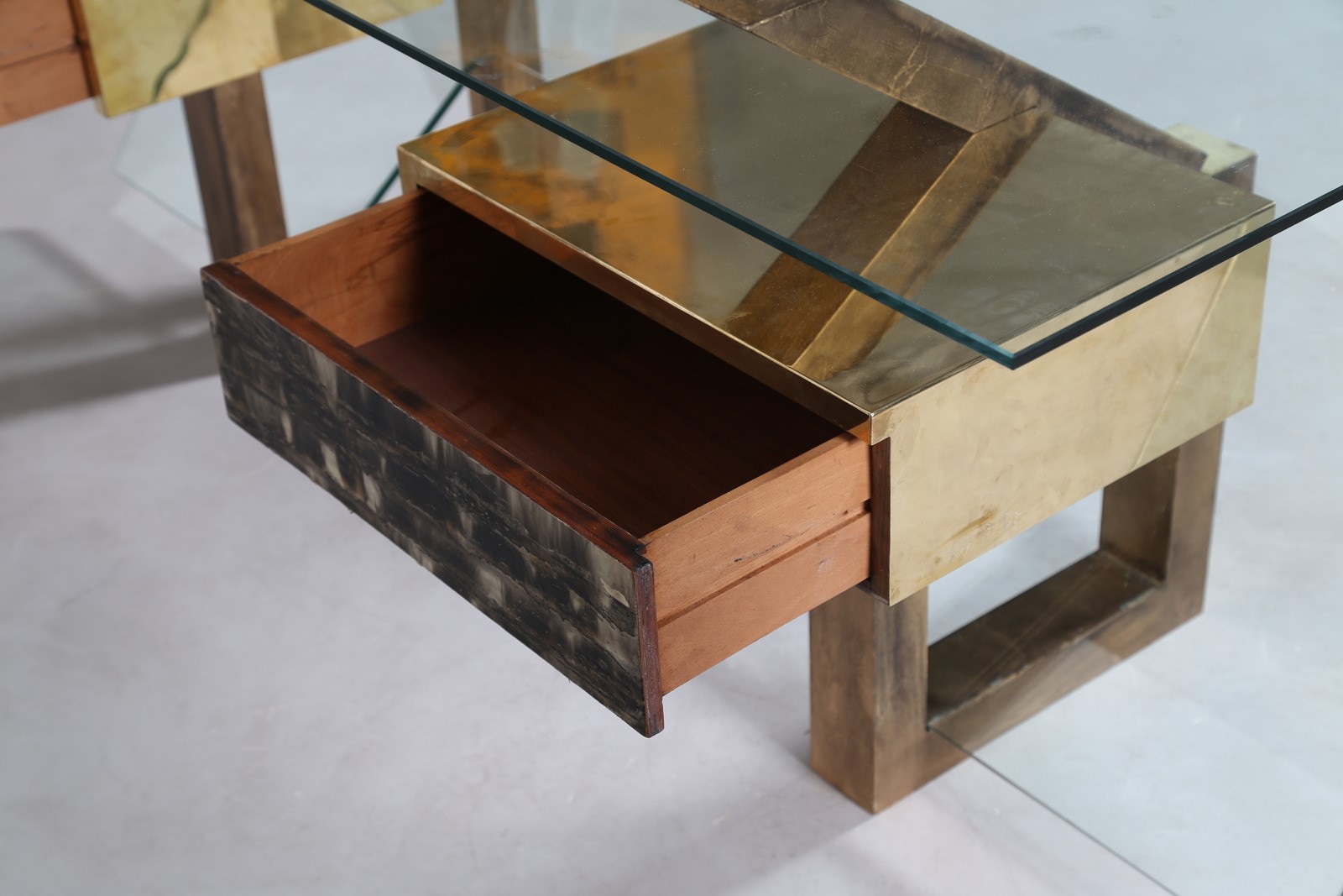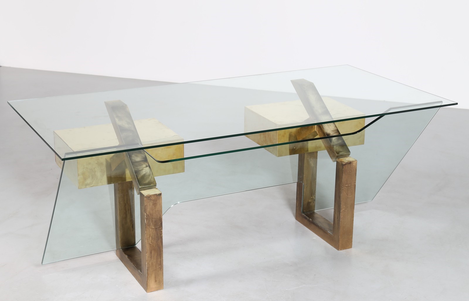 PILLANT MORDECAI Desk. Aluminium and glass.. Cm 190,00 x 76,00 x 92,00. Desk in golden and patinated aluminium, combustion covered on paper drawers, crystal central top and junction, mod. Loviscan, Unique piece, Italy, 2014