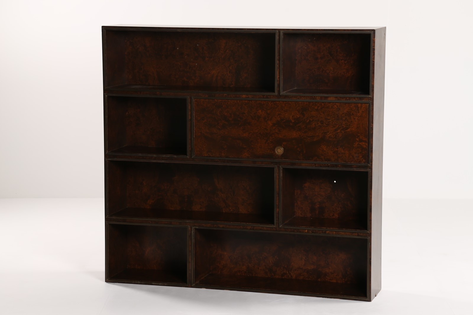 RIZZO WILLY (1928 - 2013) Libreria. 1970. Radica, laminato e ottone. Cm 159,00 x 150,50 x 31,00. Struttura in radica, profili in laminato e dettagli in ottone. Produzione Mario Sabot, Udine, anni 70.