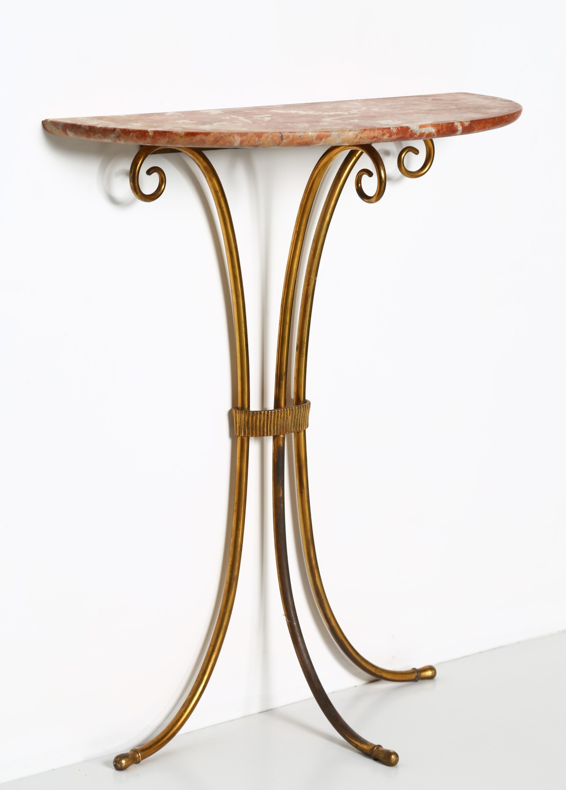 MANIFATTURA ITALIANA Consolle. Marmo e ottone. Cm 67,00 x 82,00 x 28,00. Base in ottone lavorato e piano in marmo rosso di Verona, anni 80.