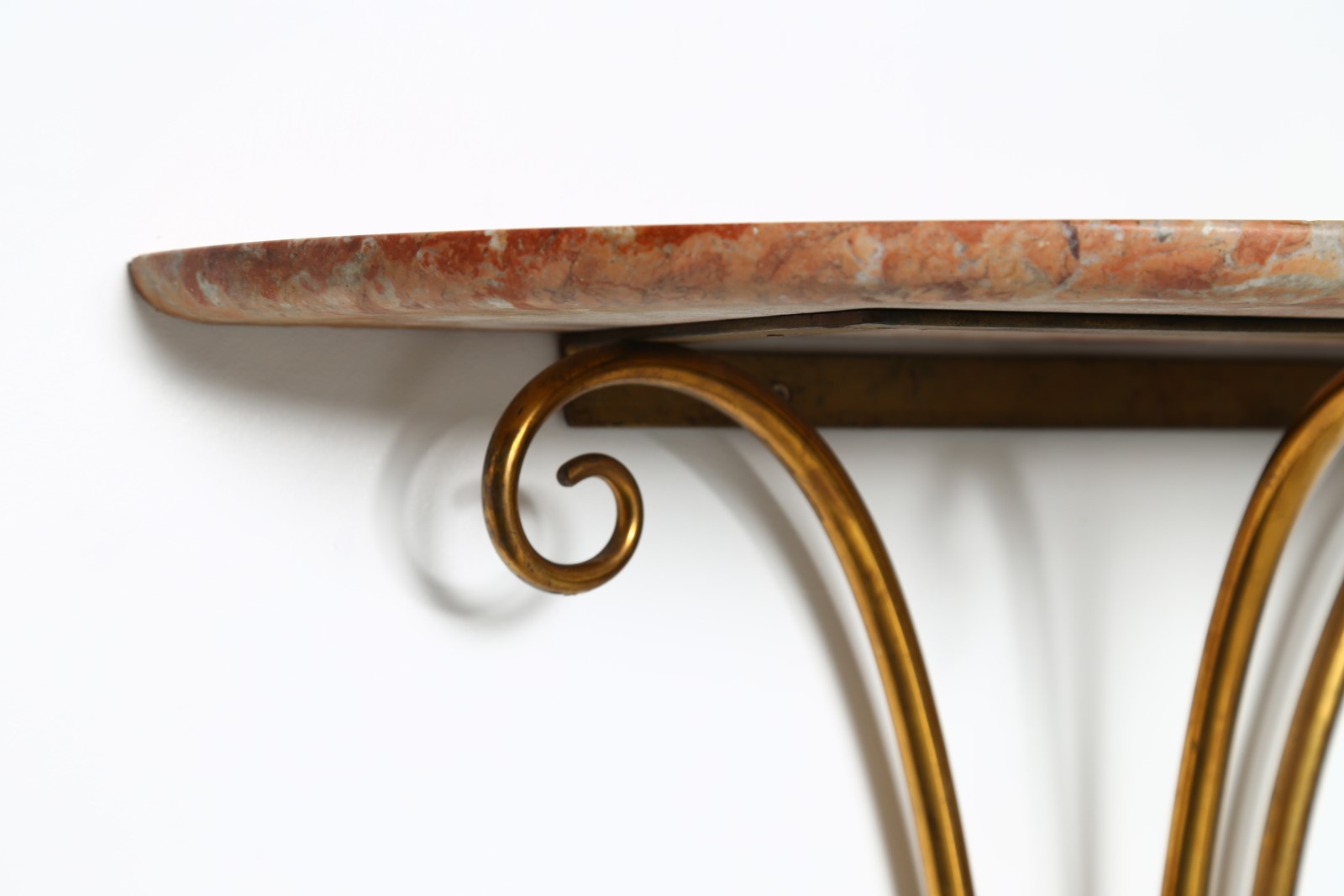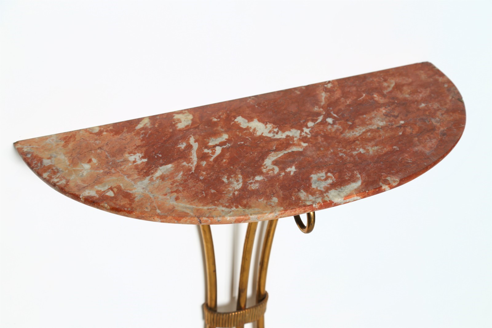 ITALIAN MANUFACTURE Console. Marble and brass. Cm 67,00 x 82,00 x 28,00. Base in worked brass and top in red Verona marble, 80s.