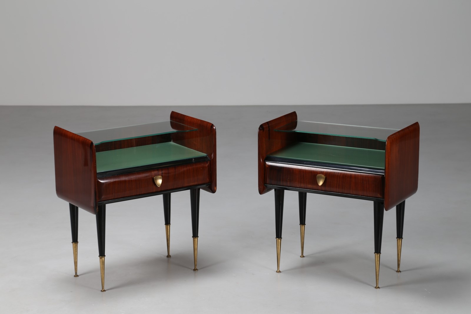 ITALIAN MANUFACTURE Pair of bedside tables. Wood, brass, glass. Cm 54,00 x 65,00 x 34,00. Lacquered wood base, brass tips, rosewood structure with glass shelves. 50s.