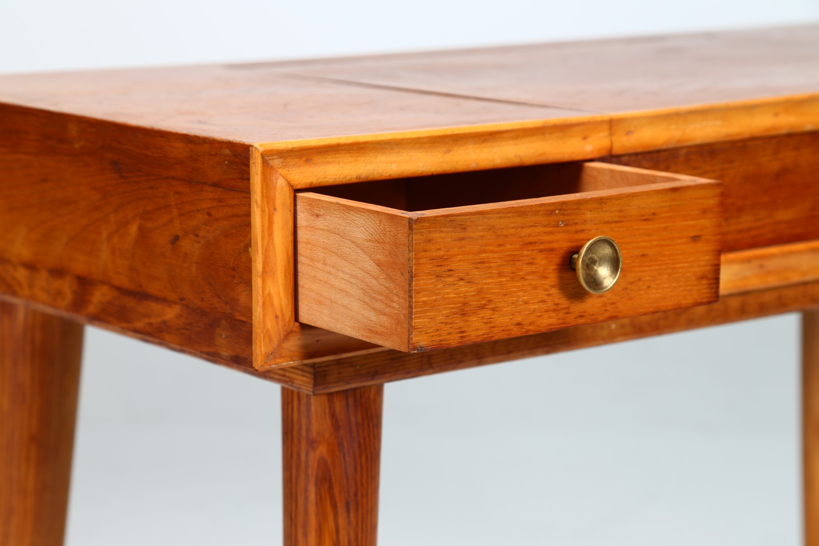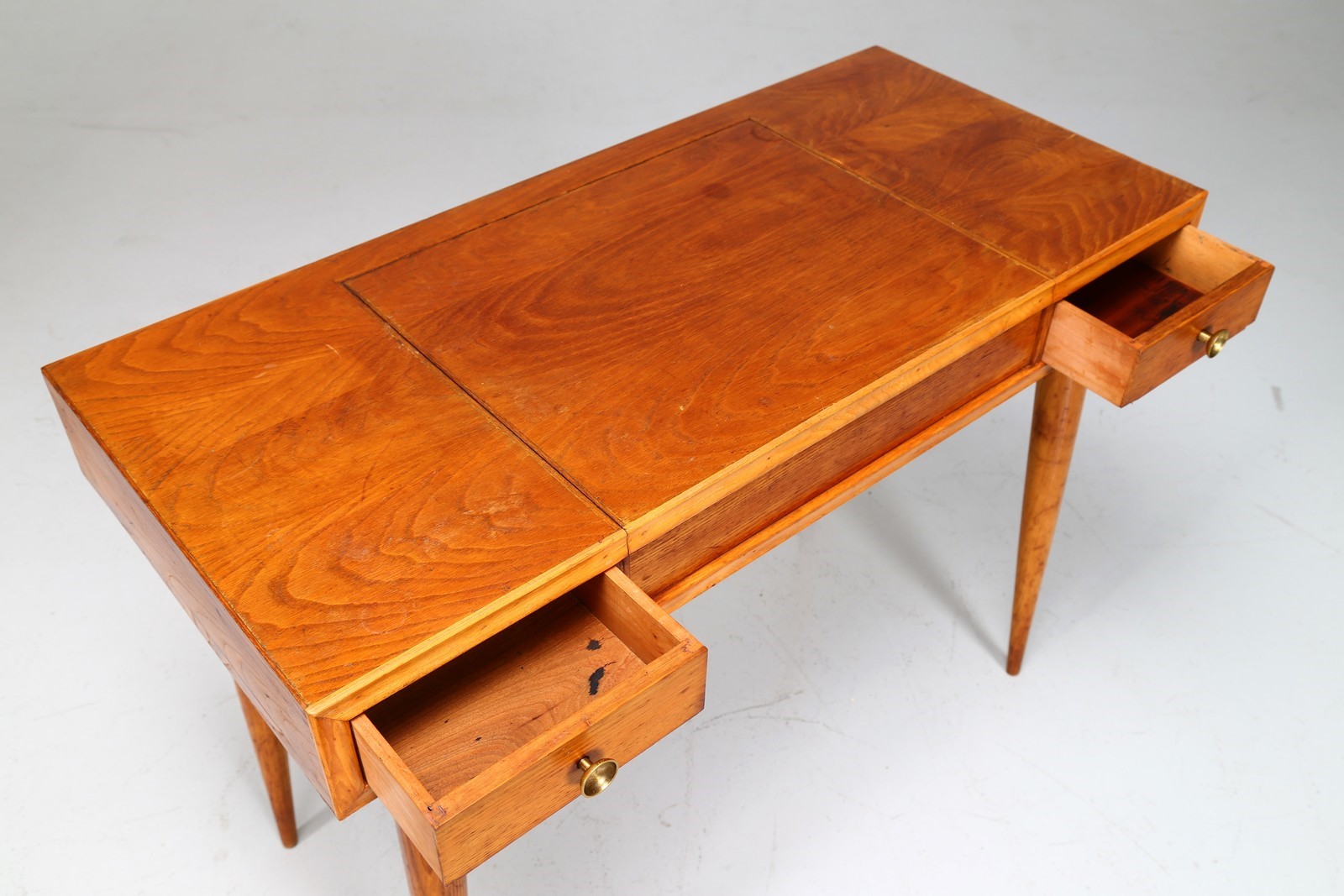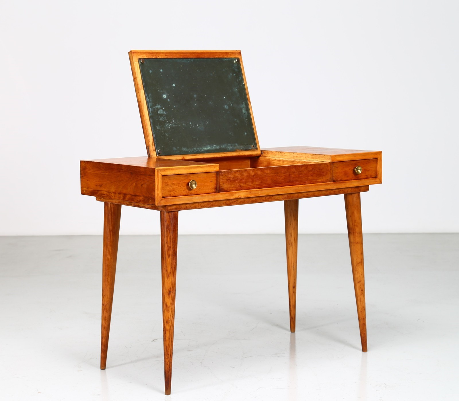 MANIFATTURA ITALIANA Toeletta. Legno ottone e vetro. Cm 100,00 x 111,00 x 46,00. Struttura in legno di olmo, dettagli in ottone e specchio. Anni 40.