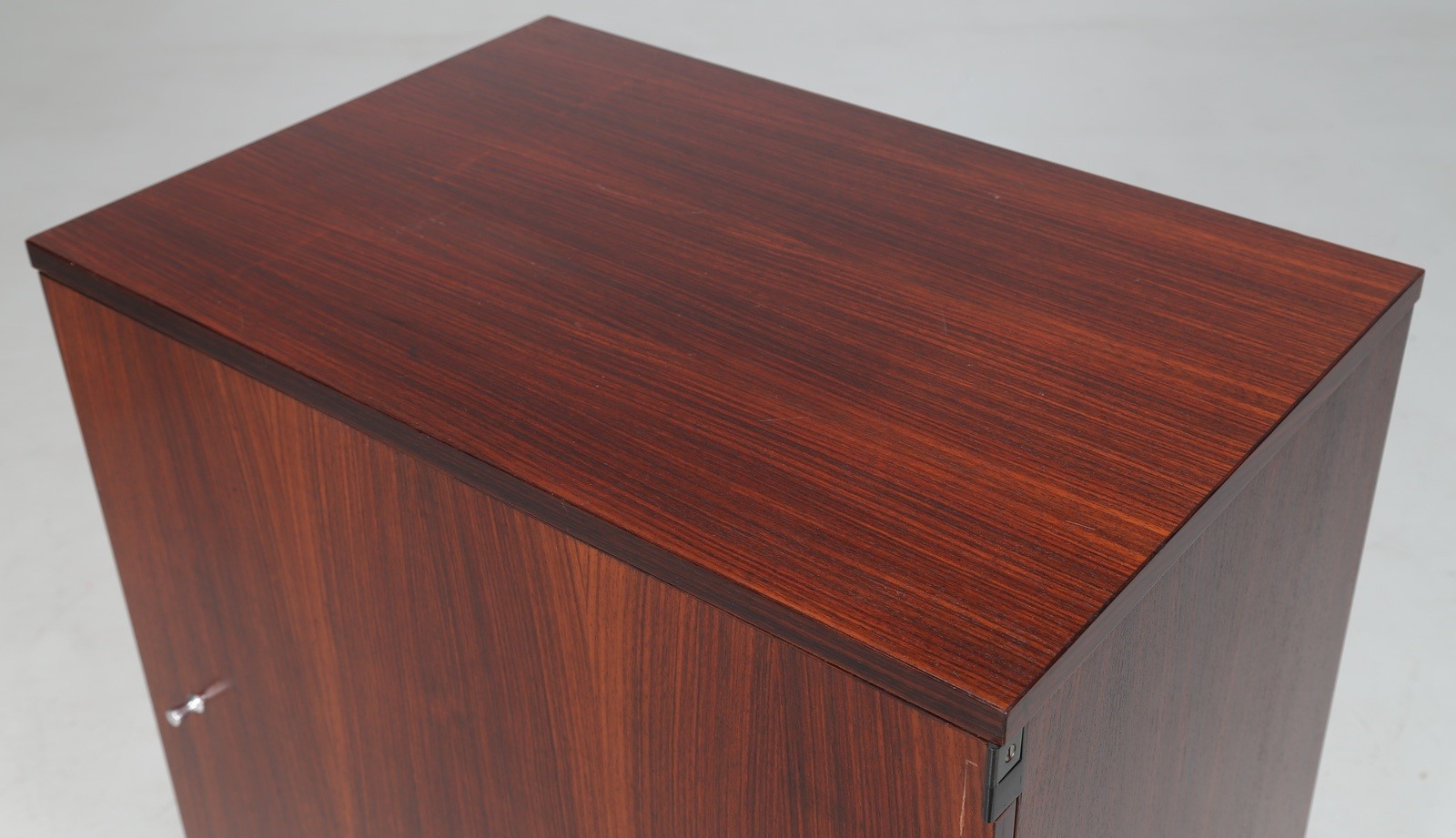 MIM Mobiletto. Legno di palissandro e metallo. Cm 67,00 x 84,00 x 45,00. Legno di palissandro, dettagli in metallo cromato. Per MIM, Roma (Marchio dell'azienda produttrice), anni 60.