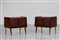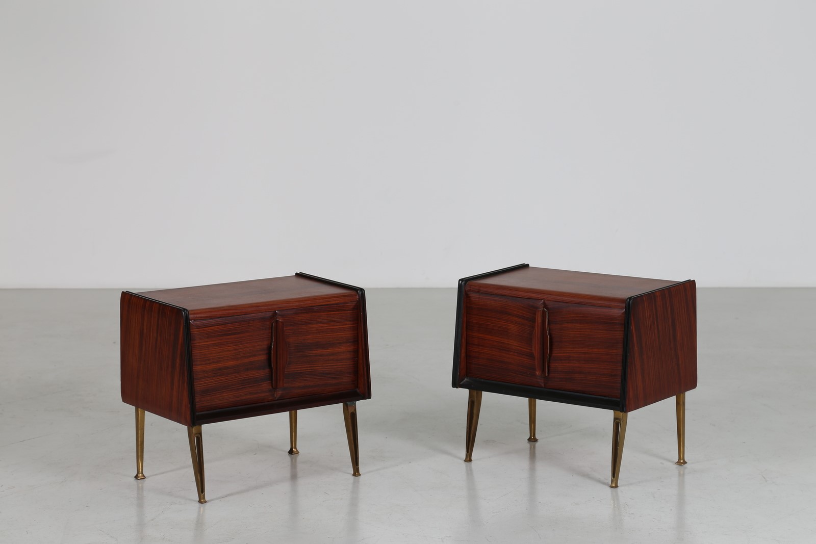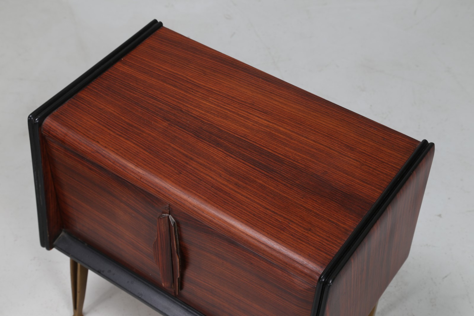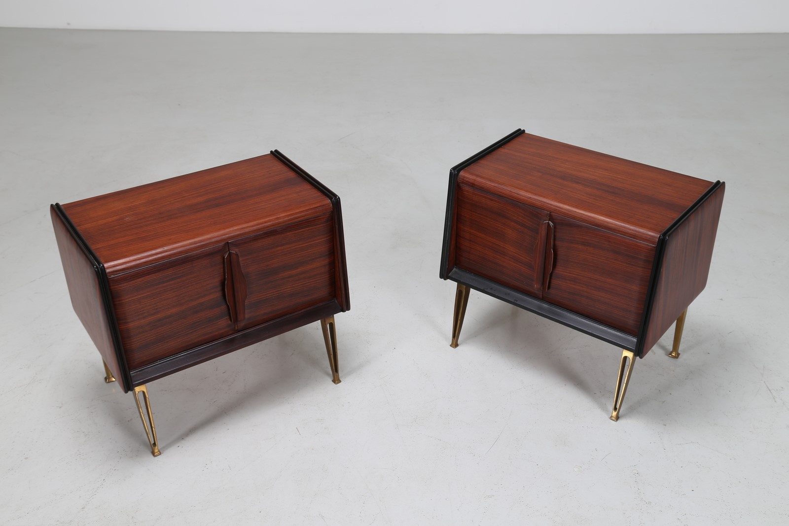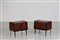 MANIFATTURA ITALIANA Coppia di comodini. Legno di palissandro e ottone. Cm 56,00 x 51,00 x 36,00. Struttura in legno di palissandro e ottone, anni 50.