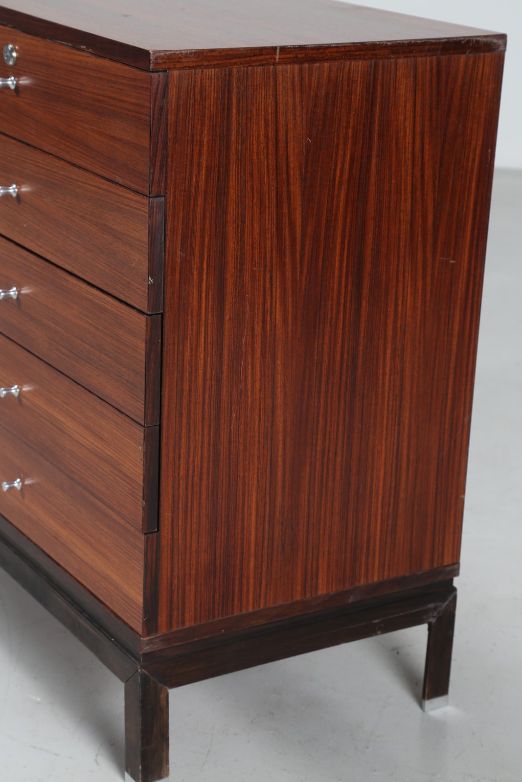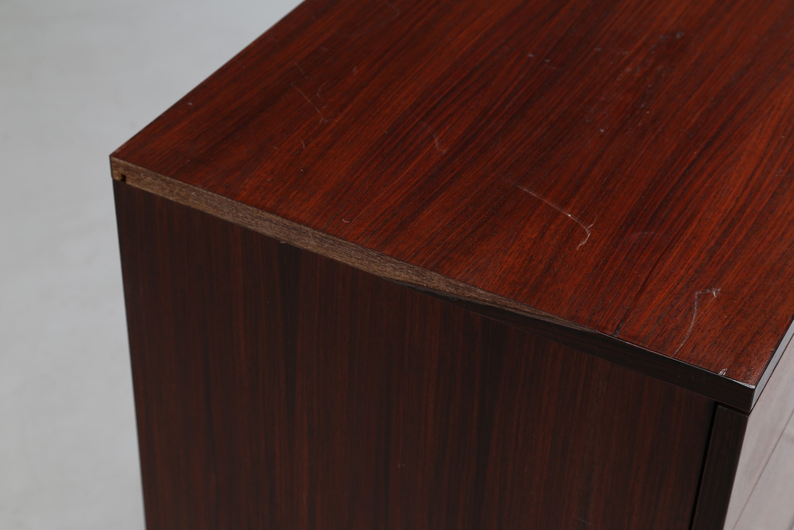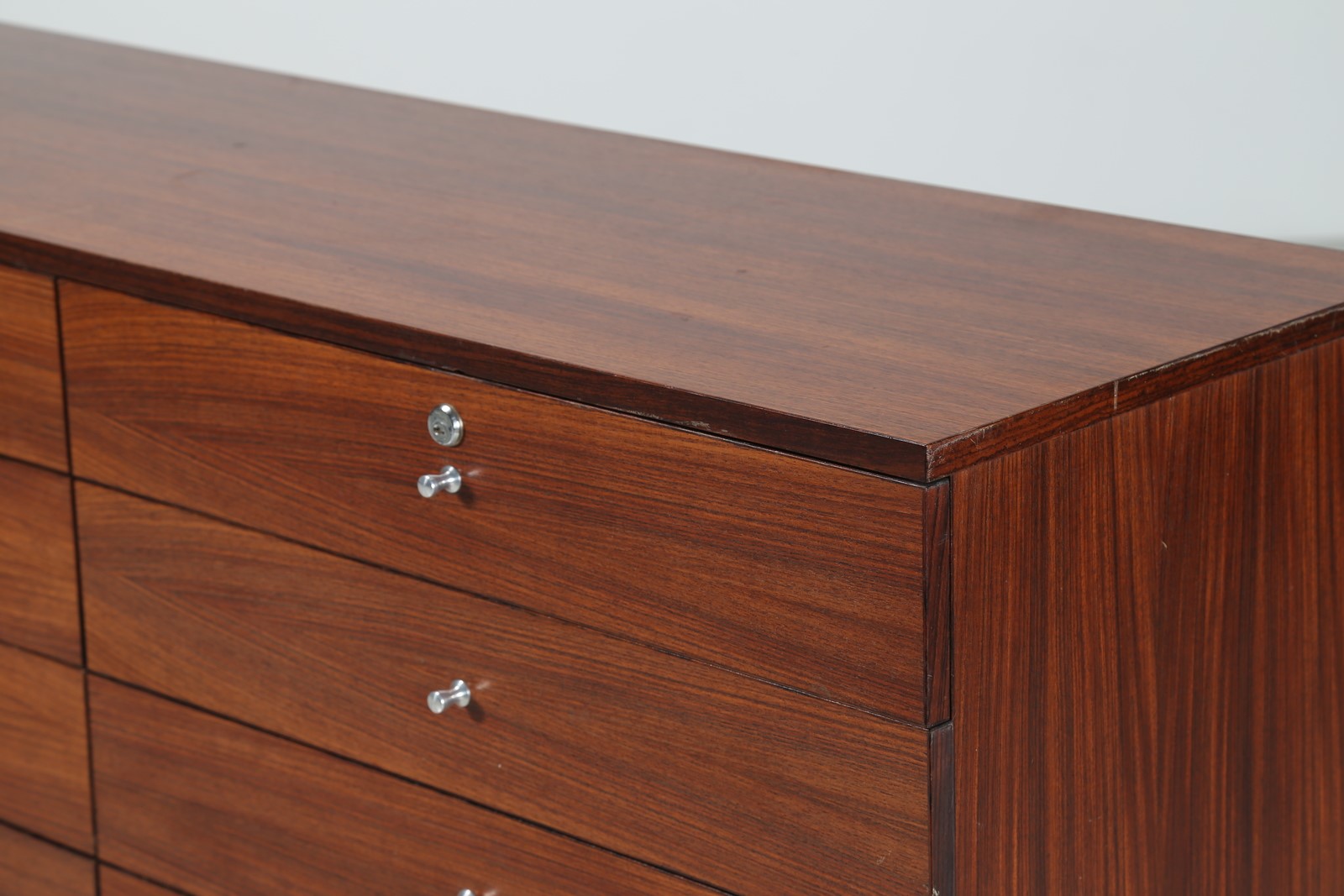 MIM Cassettiera . Legno di palissandro. Cm 135,00 x 84,00 x 45,00. Struttura in legno di palissandro, per mobilificio MIM, Roma (Marchio dell'azienda manifatturiera) anni 60.
