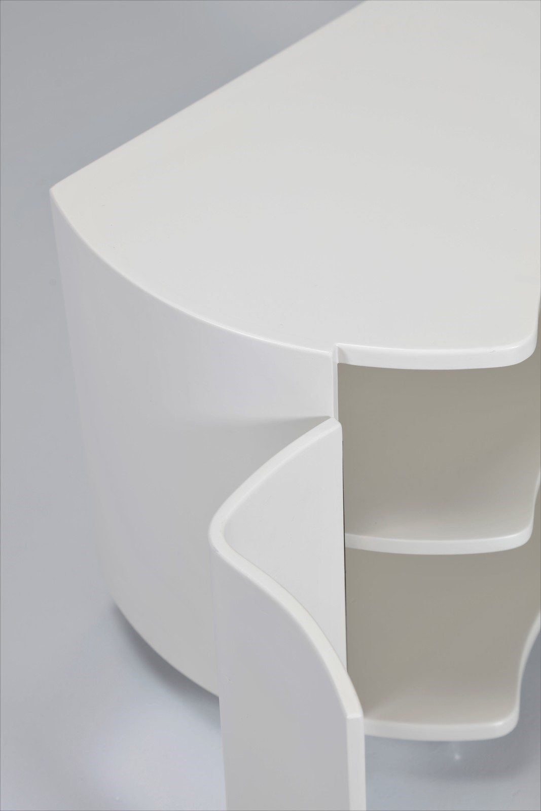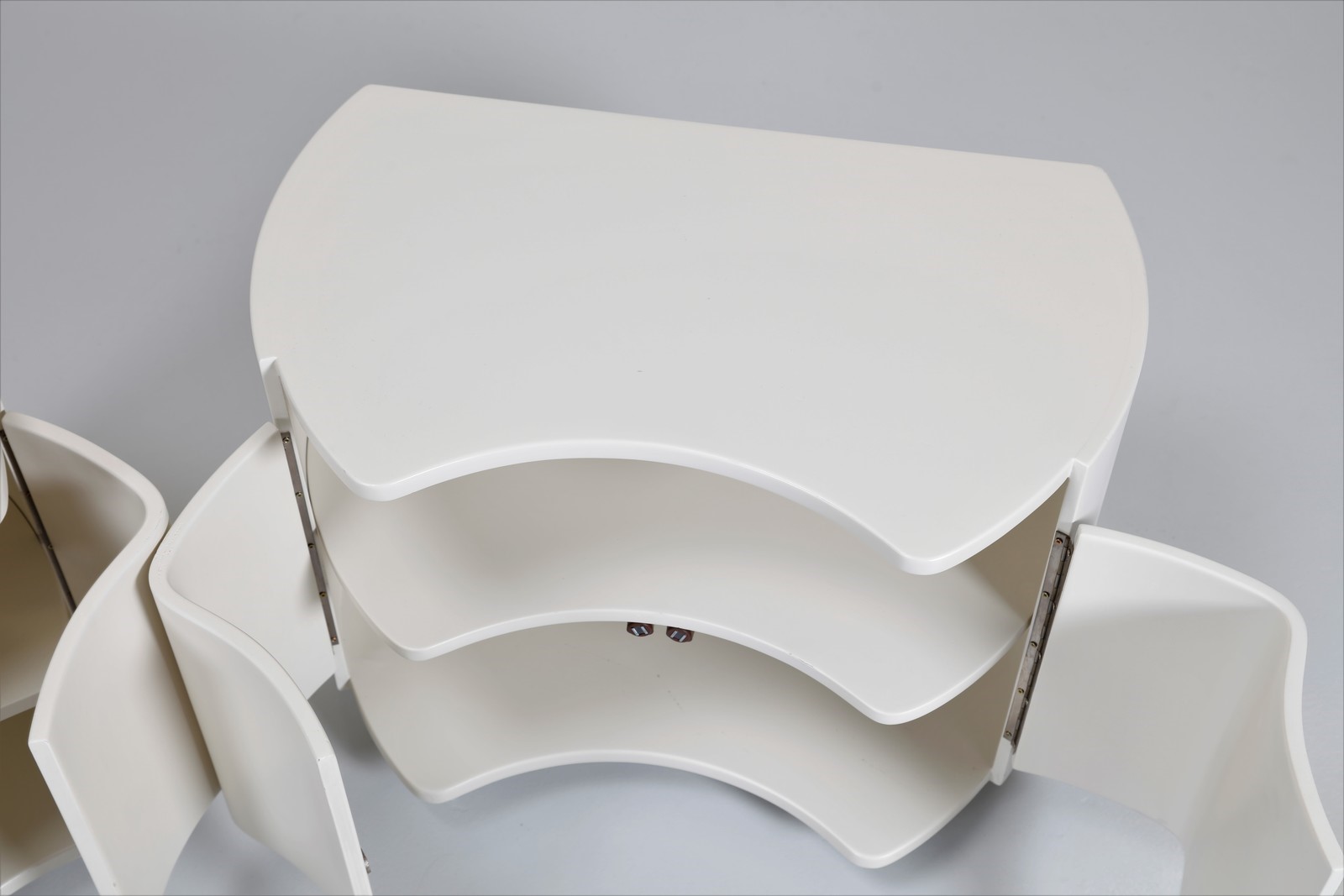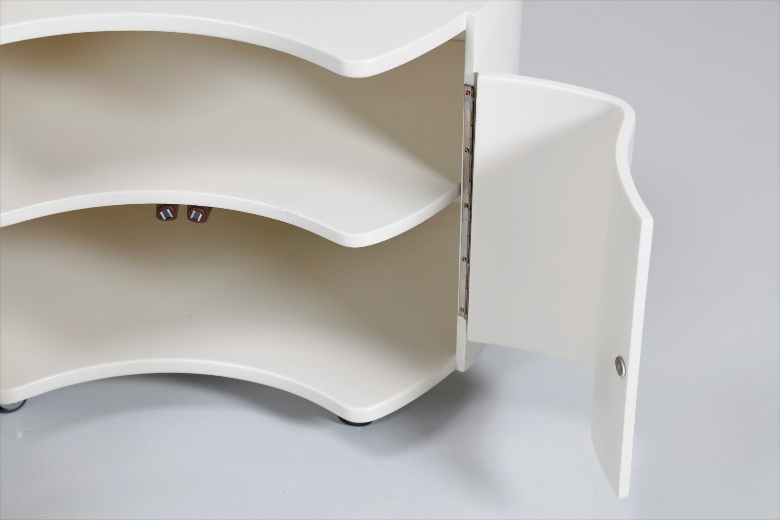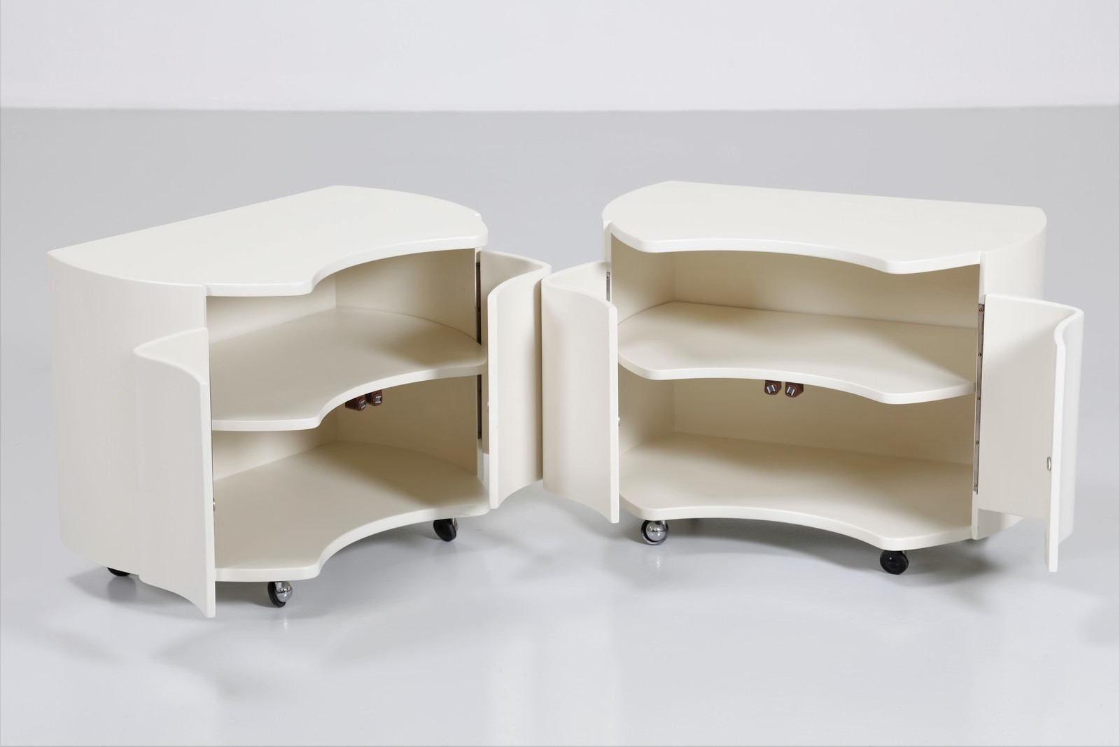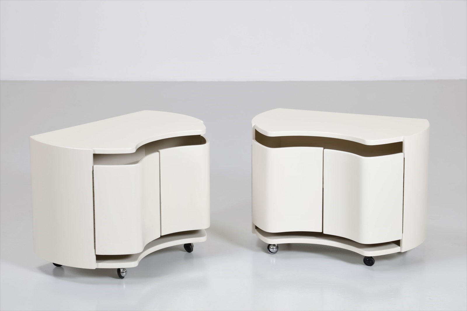 GAVINA SIMON Attrib. Coppia di comodini. Legno laccato. Cm 60,00 x 44,50 x 38,00. Struttura in legno laccato bianco rotelline in metallo cromato. Fine anni 70.